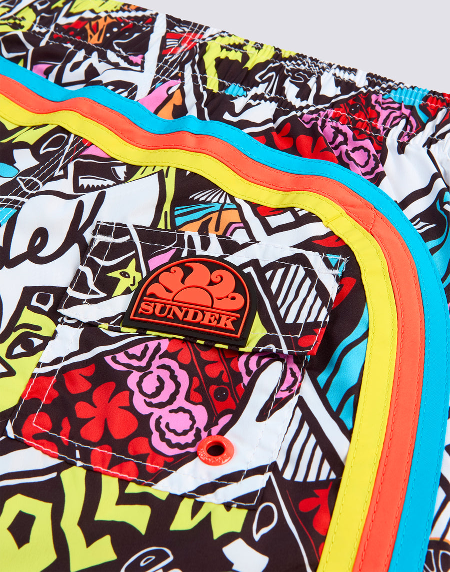 Swimshorts with elasticated drawstring waist, in lightweight Repreve® fabric recycled from plastic bottles. With Cartoon print and the traditional Sundek rainbow on the back. Outer thigh length 10.25"/26 cm (in size 6 years).