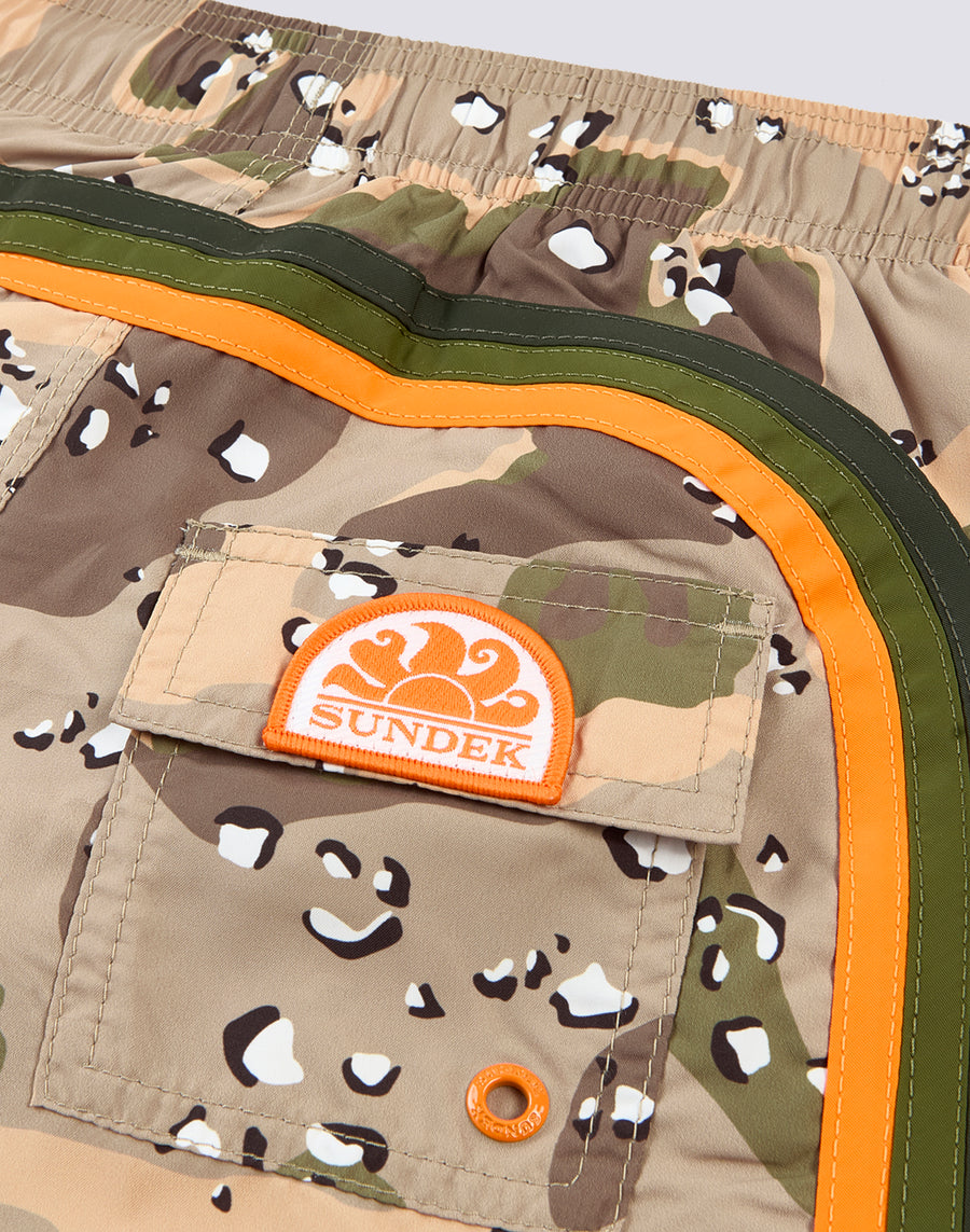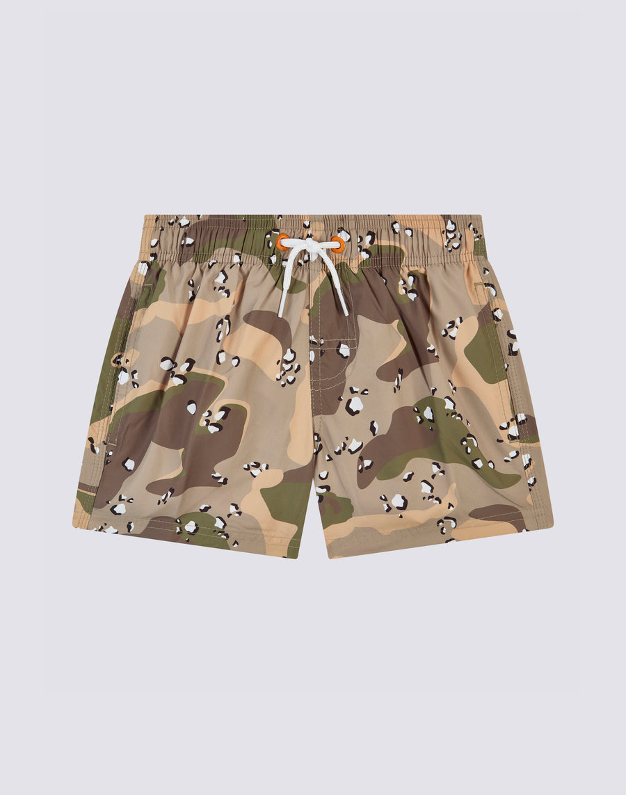 Swimshorts with elasticated drawstring waist, in lightweight Repreve® fabric recycled from plastic bottles. With Spotted Camo print and the traditional Sundek rainbow on the back. Outer thigh length 10.25"/26 cm (in size 6 years).