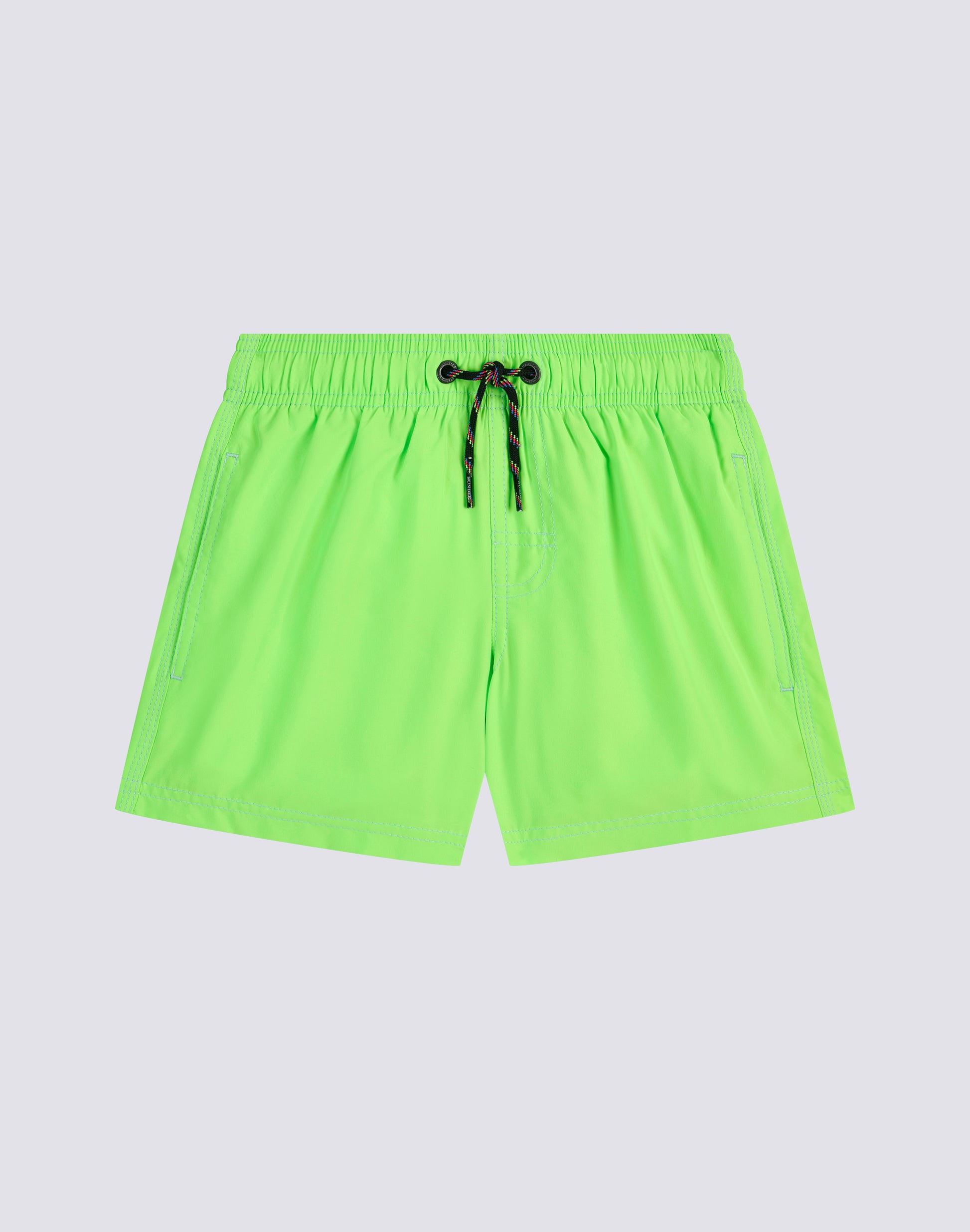 Child's short swimshorts in lightweight, quick-drying Repreve® fluo recycled fabric. Sundek iconic rainbow detail on the back and black drawstring strap. Outer thigh length 10.25"/26 CM (in size 6 years).