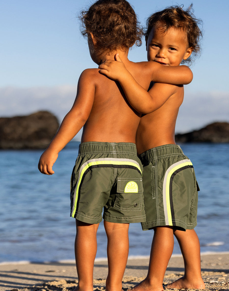 These boys' swim shorts feature intense colours and a super-comfortable, quick-drying fabric. A style that will accompany your little boy in all his holiday activities, perfect for moving around and playing in complete freedom. Made from our classic nylon taffeta fabric and constructed with three-needle stitching for durability. Pack them in your suitcase year after year.