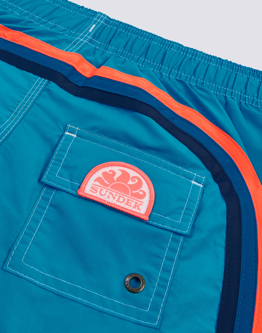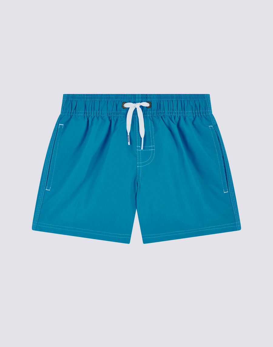 Intense colour and ultra-comfortable, quick-drying fabric for these children's beach shorts. A model that will accompany your child in his many activities on holiday, perfect for moving around and playing in complete freedom. It is made of our historical nylon-taffeta fabric and constructed with three-needle stitching that makes it durable. To pack year after year.