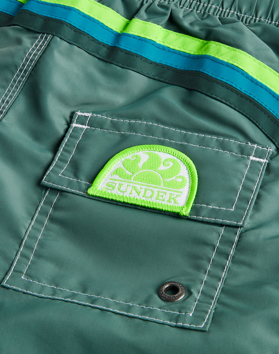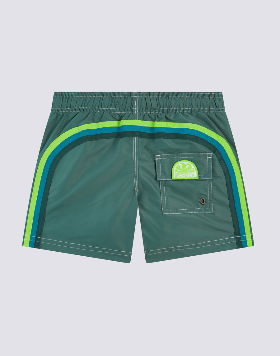 Intense color and hyper-comfortable, quick-drying fabric for these boys' swim shorts. A model that will accompany your child in his thousand holiday activities, perfect for moving and playing in complete freedom. it's made from our heritage nylon-taffeta fabric and constructed with three-needle stitching that makes it durable over time. To pack in your suitcase, year after year.