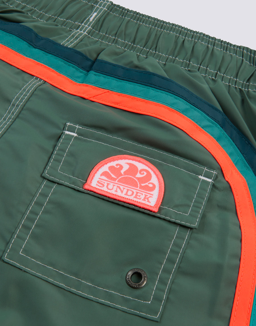Intense colour and ultra-comfortable, quick-drying fabric for these children's beach shorts. A model that will accompany your child in his many activities on holiday, perfect for moving around and playing in complete freedom. It is made of our historical nylon-taffeta fabric and constructed with three-needle stitching that makes it durable. To pack year after year.