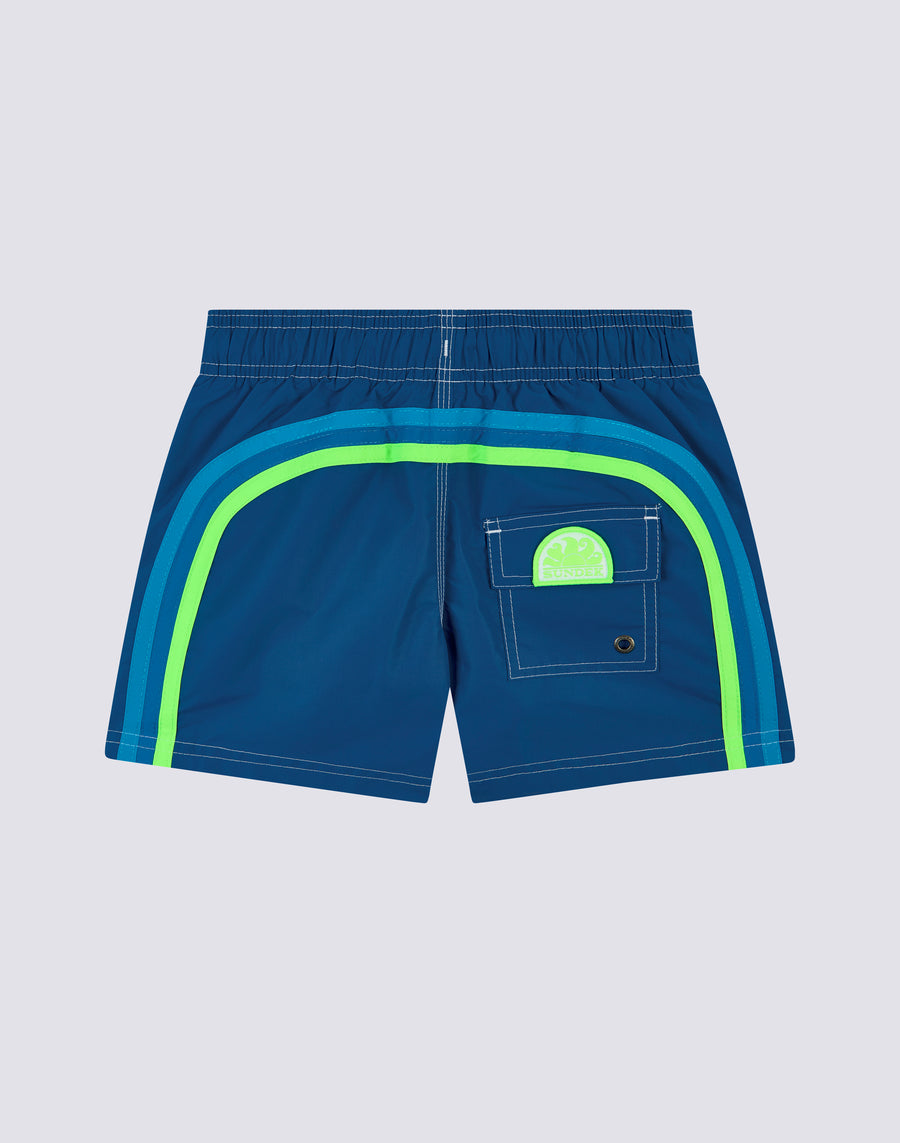 Intense colour and ultra-comfortable, quick-drying fabric for these children's beach shorts. A model that will accompany your child in his many activities on holiday, perfect for moving around and playing in complete freedom. It is made of our historical nylon-taffeta fabric and constructed with three-needle stitching that makes it durable. To pack year after year.