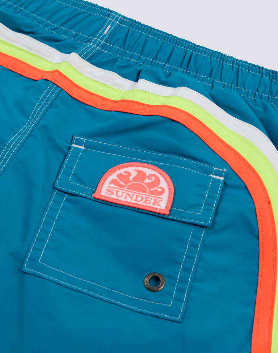 Intense colour and ultra-comfortable, quick-drying fabric for these children's beach shorts. A model that will accompany your child in his many activities on holiday, perfect for moving around and playing in complete freedom. It is made of our historical nylon-taffeta fabric and constructed with three-needle stitching that makes it durable. To pack year after year.