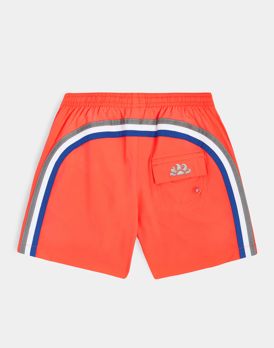 Intense color and hyper-comfortable quick-drying fabric for these boy's beach shorts. A model that will accompany your child in his many activities on holiday, perfect for moving and playing freely. Lightweight, resistant, dries very quickly and is made of 4 Way Stretch fabric. It has our classic three-needle stitching for added durability and our iconic rainbow to the reverse.