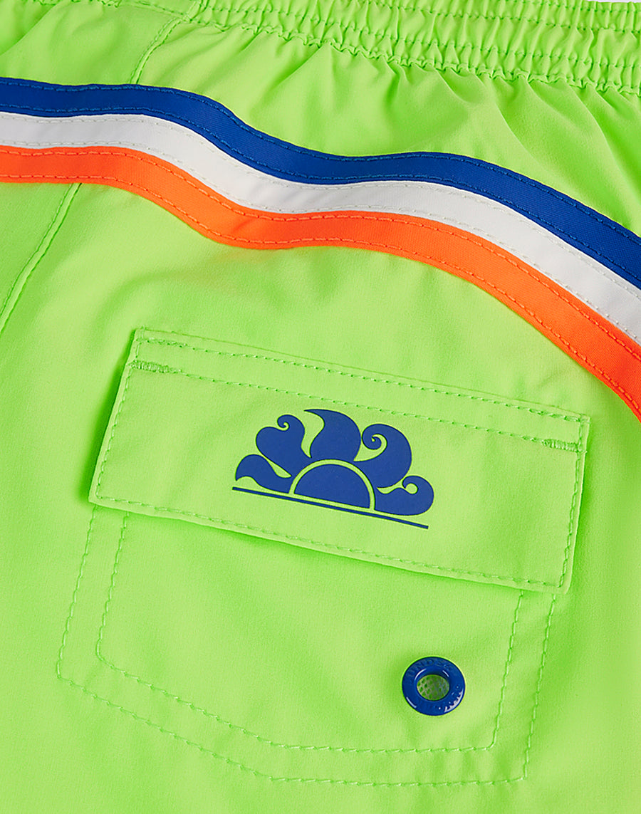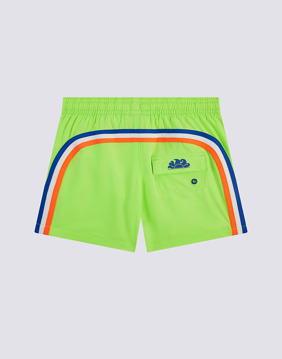Intense color and hyper-comfortable, quick-drying fabric for these boys' swim shorts. A model that will accompany your child in his thousand holiday activities, perfect for moving and playing in complete freedom. Lightweight, resistant, dries very quickly and is made of 4 Way Stretch fabric. It has our classic three-needle stitching that increases durability and our iconic rainbow on the back.