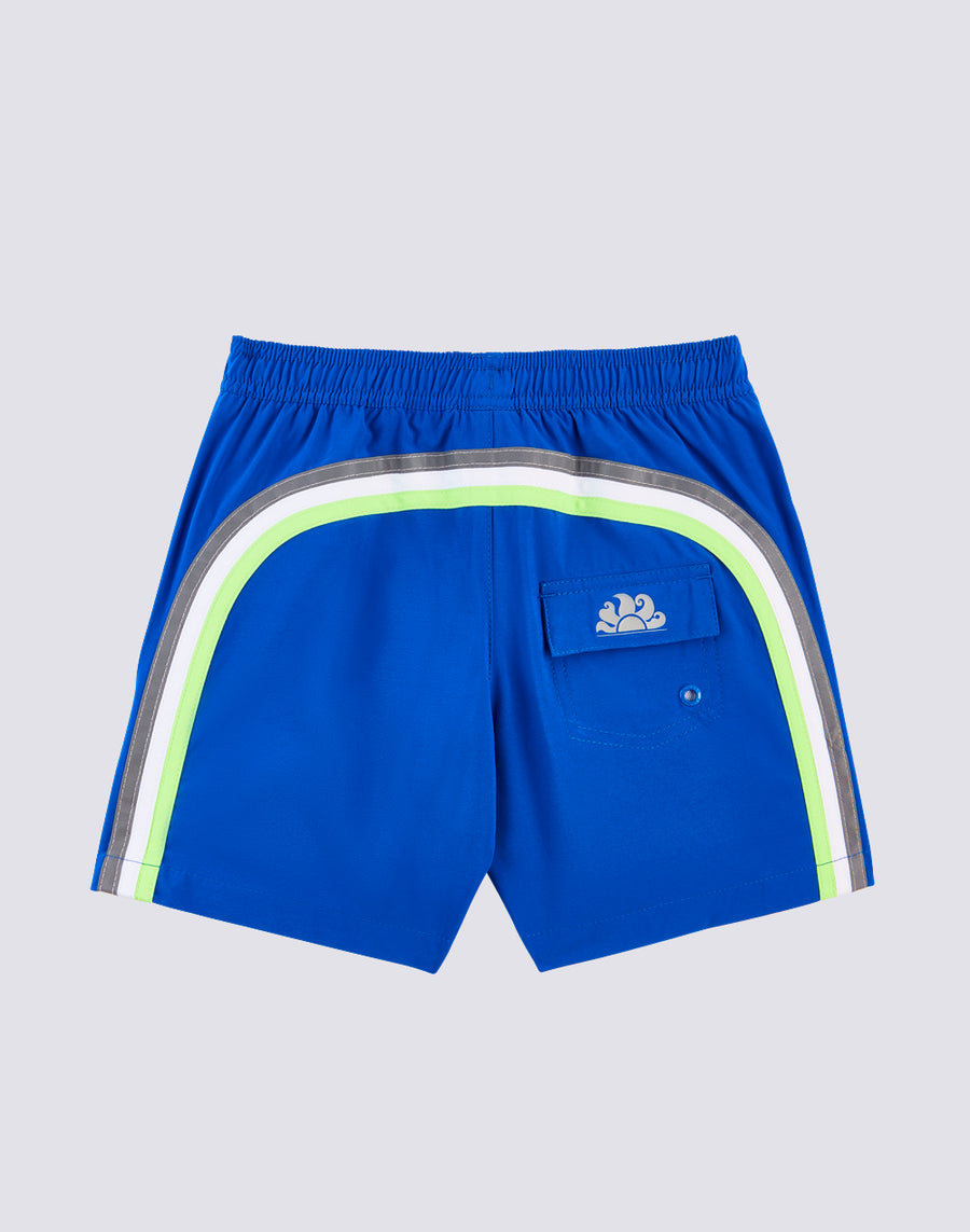 Intense color and hyper-comfortable quick-drying fabric for these boy's beach shorts. A model that will accompany your child in his many activities on holiday, perfect for moving and playing freely. Lightweight, resistant, dries very quickly and is made of 4 Way Stretch fabric. It has our classic three-needle stitching for added durability and our iconic rainbow to the reverse.