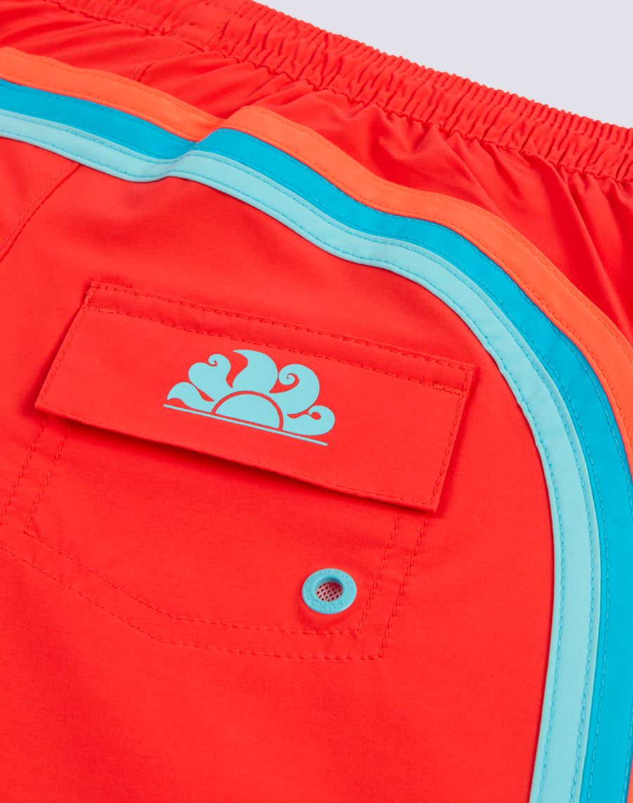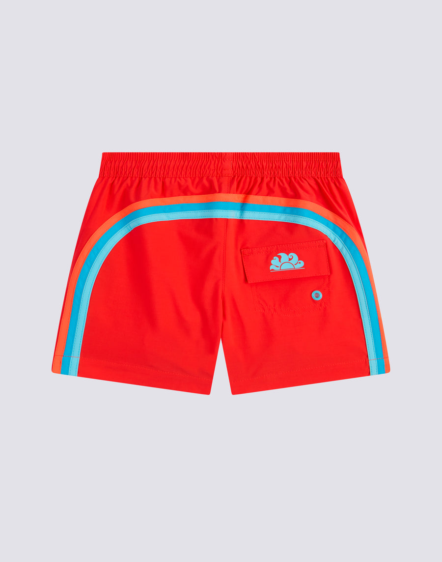 Intense colour and ultra-comfortable, quick-drying fabric for these swimming shorts for boys. A model that will accompany your child in his many activities on holiday, perfect for moving and playing in complete freedom. Lightweight, durable, quick-drying and made of 4 Way Stretch fabric. It has our classic three-needle stitching for added durability and our iconic rainbow on the back.