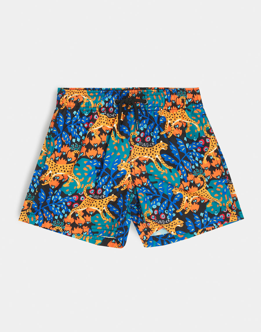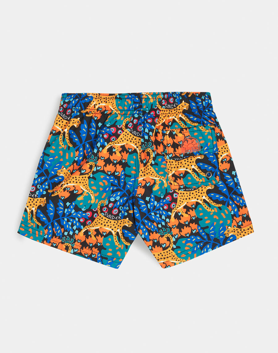 Intense colours and ultra-comfortable recycled polyester fabric for these swimming shorts for boys. A model that will accompany your child in his many activities on holiday, perfect for moving and playing in complete freedom. Made with a safari print, it's one to pack year after year.