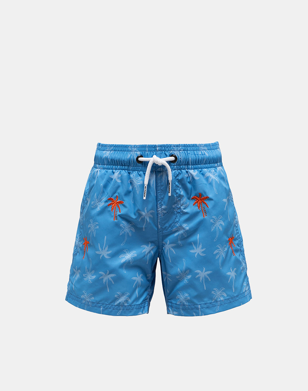 The all-over Mini Palm print on these boys' swim boxers is embellished with contrasting embroidery for a unique optical effect. Easy to slip on, they are very lightweight, dry quickly, and are made from eco-friendly recycled fabric. A suitcase staple to w
