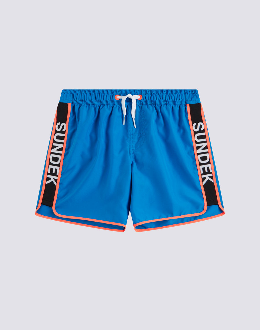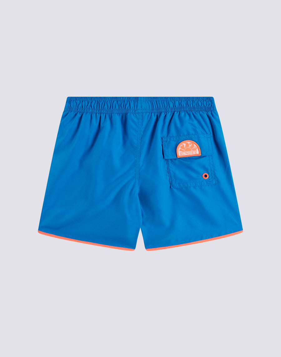 Children's swimsuit with drawstring and elasticated waist, in light polyester fabric. Equipped with rounded side vents with contrasting profiles. Outer thigh length 11.25"/28.5 cm (in size 6 years).
