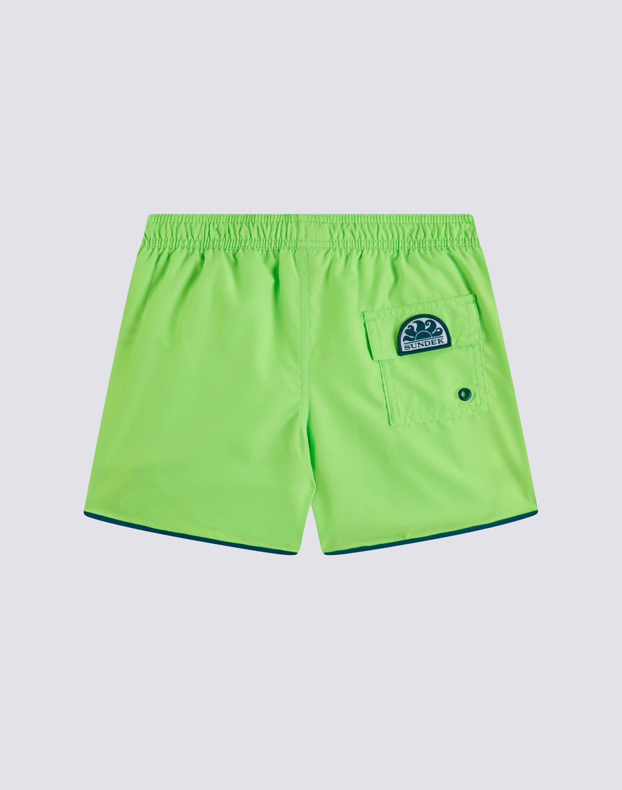 Children's swimsuit with drawstring and elasticated waist, in light polyester fabric. Equipped with rounded side vents with contrasting profiles. Outer thigh length 11.25"/28.5 cm (in size 6 years).