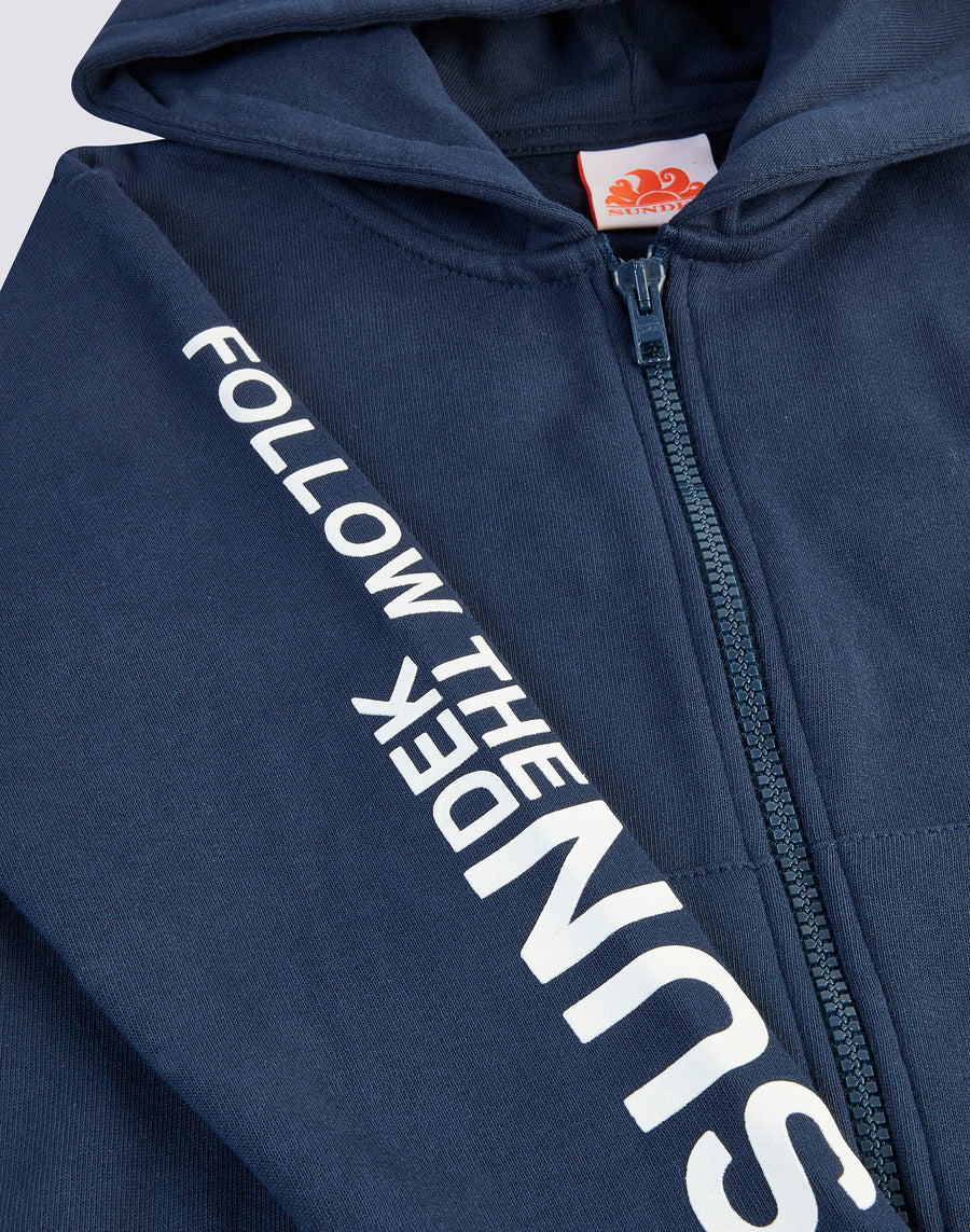 Sweatshirt with hood and zip, easy to combine on many daily occasions: for going out, for playing and doing sports. A versatile garment, always current, to immediately add to your wardrobe.