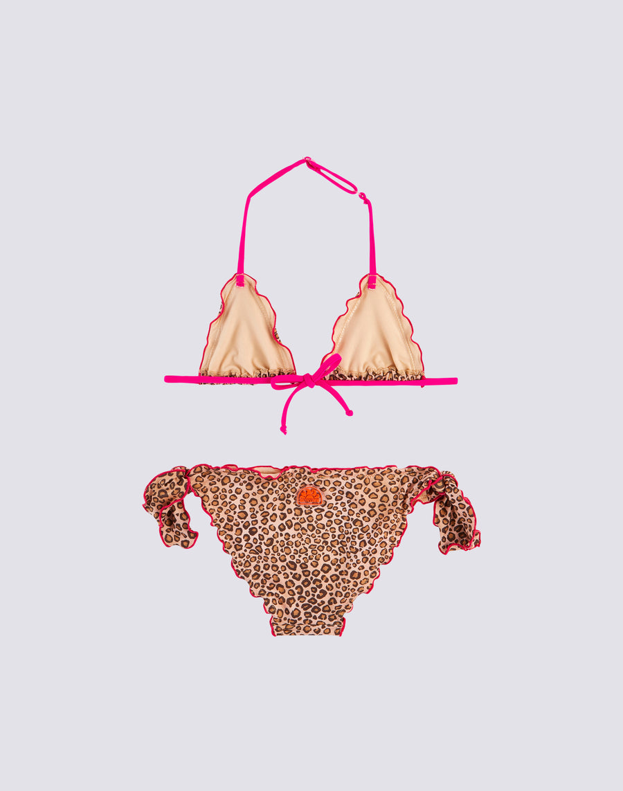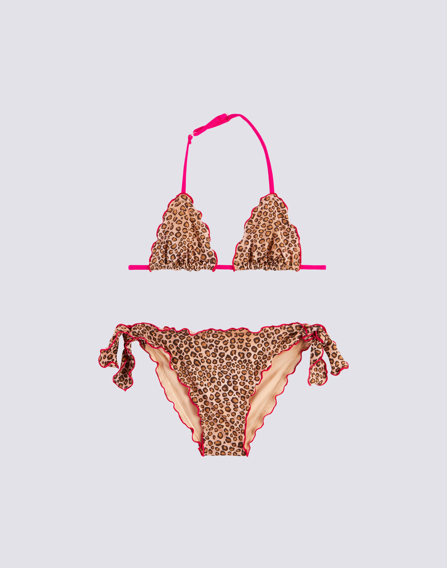 Girl's bikini consisting of a triangle top with adjustable straps and briefs with bows, also adjustable. The spotted style leorock print is the protagonist. Wearable if necessary coordinated with the same model in women's size.