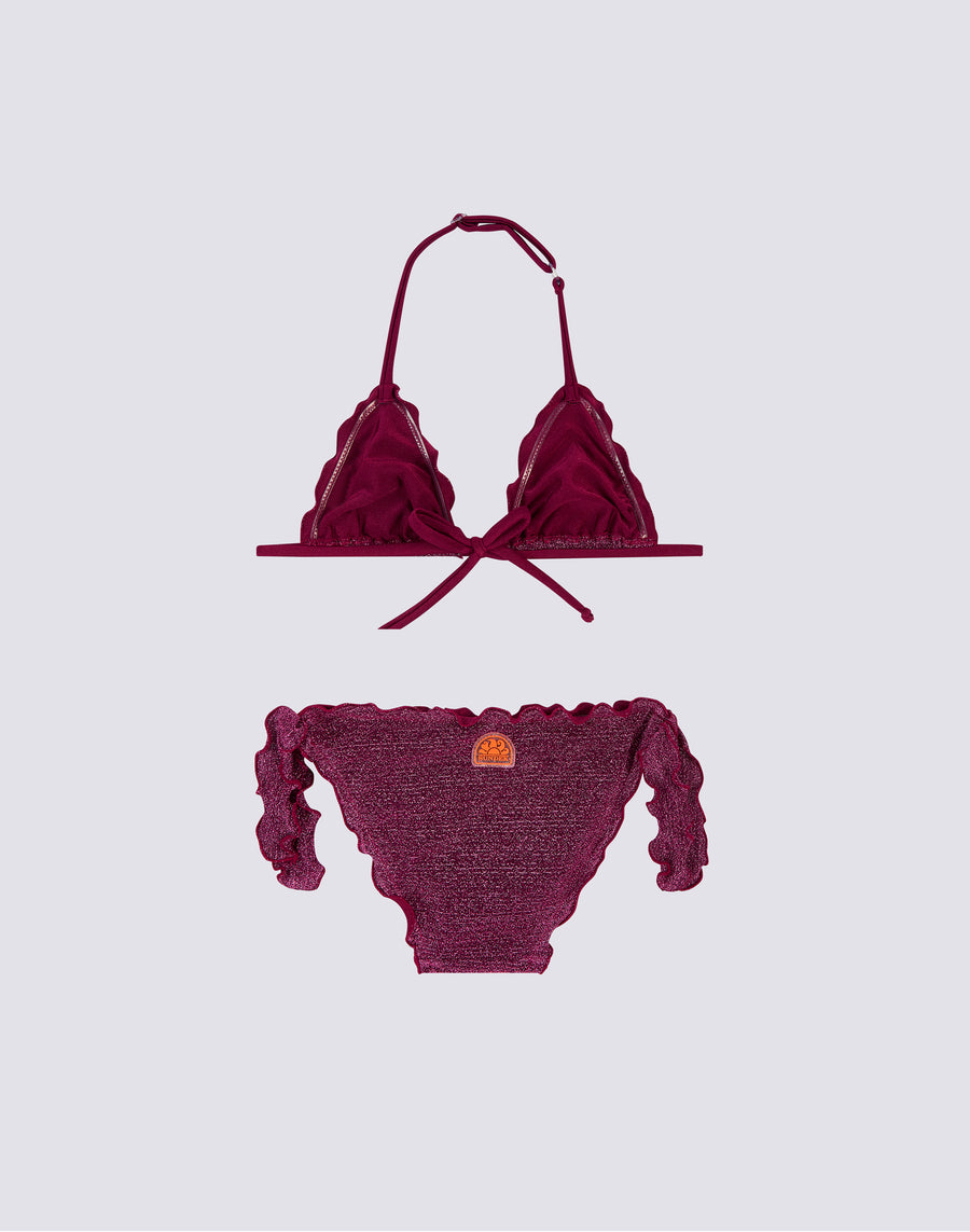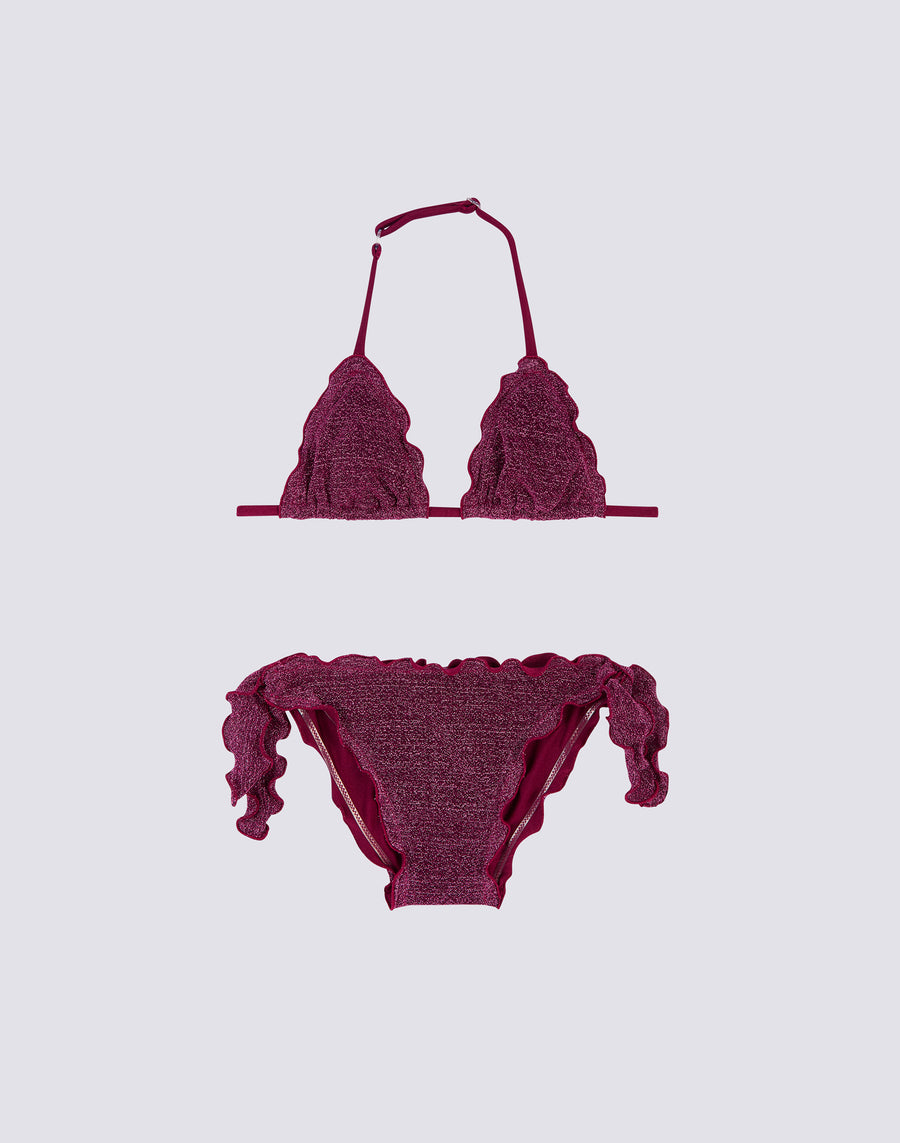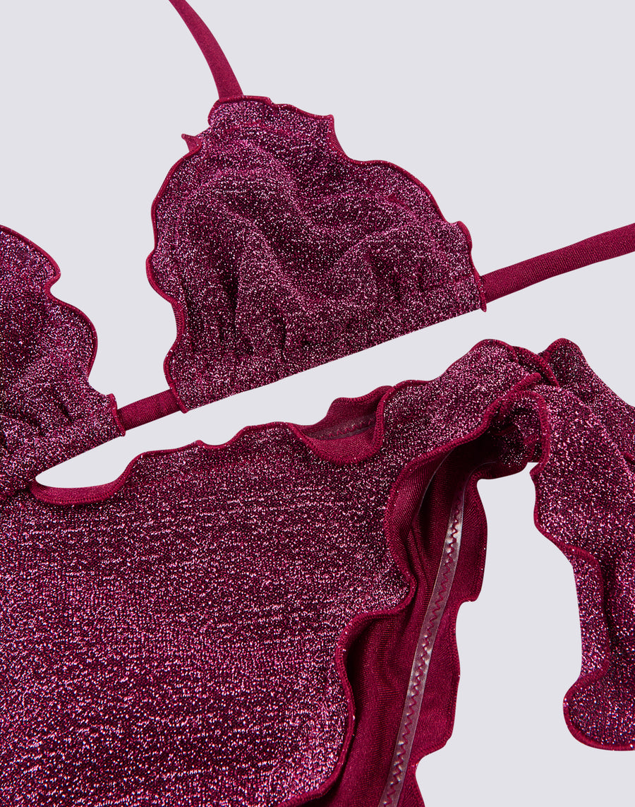 Triangle top with ruffles and adjustable ties behind neck and back, briefs with adjustable side bows and ruffles. Model in lurex.