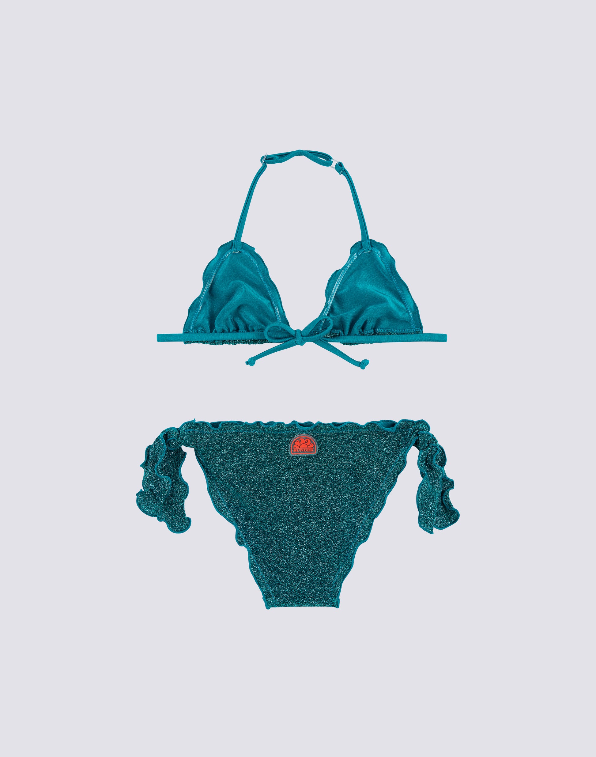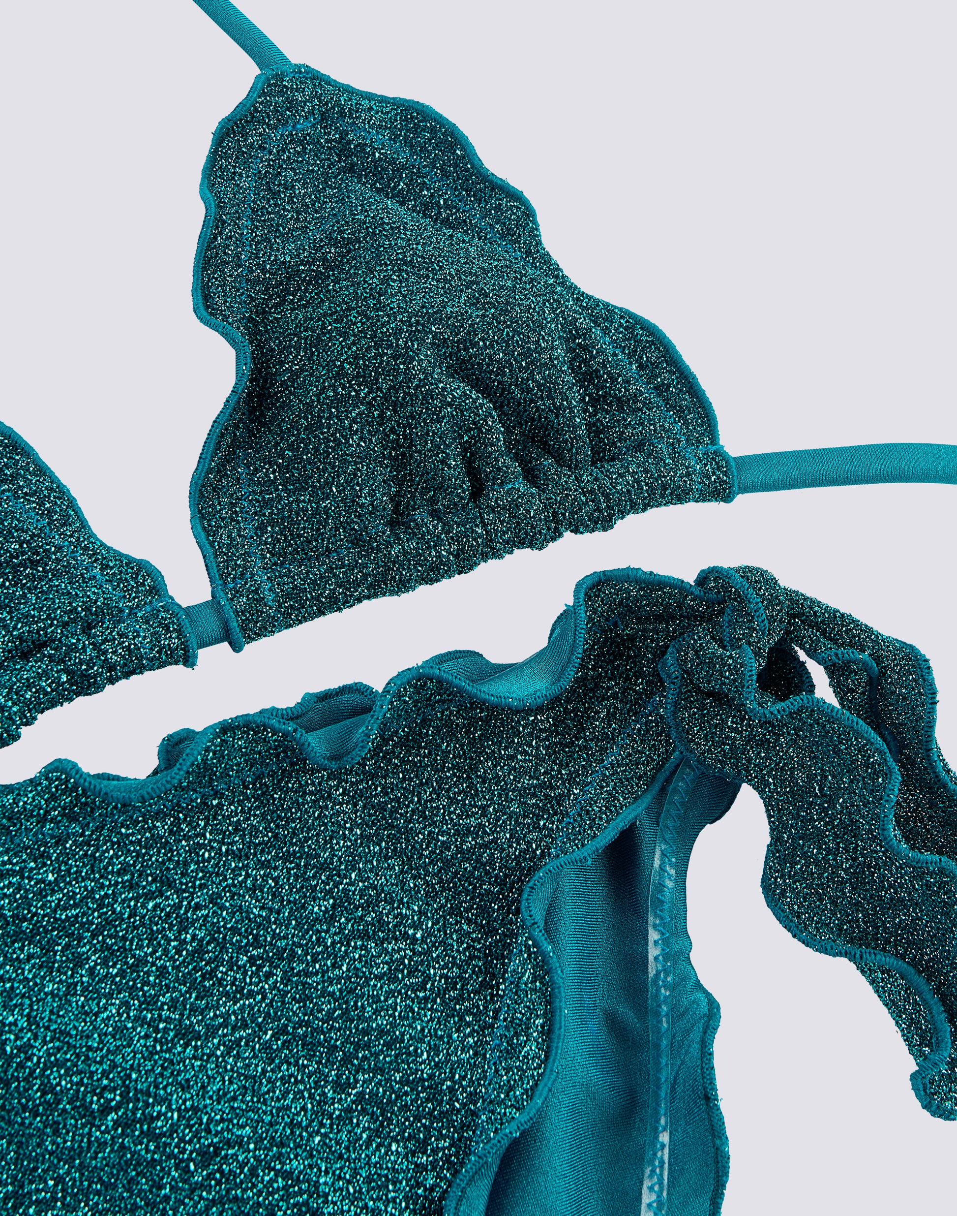 Triangle top with ruffles and adjustable ties behind neck and back, briefs with adjustable side bows and ruffles. Model in lurex.