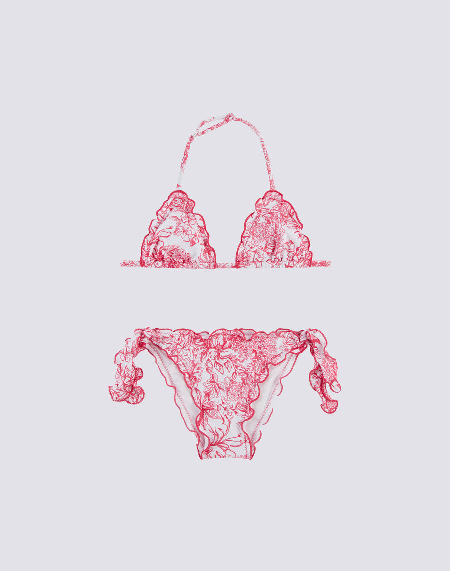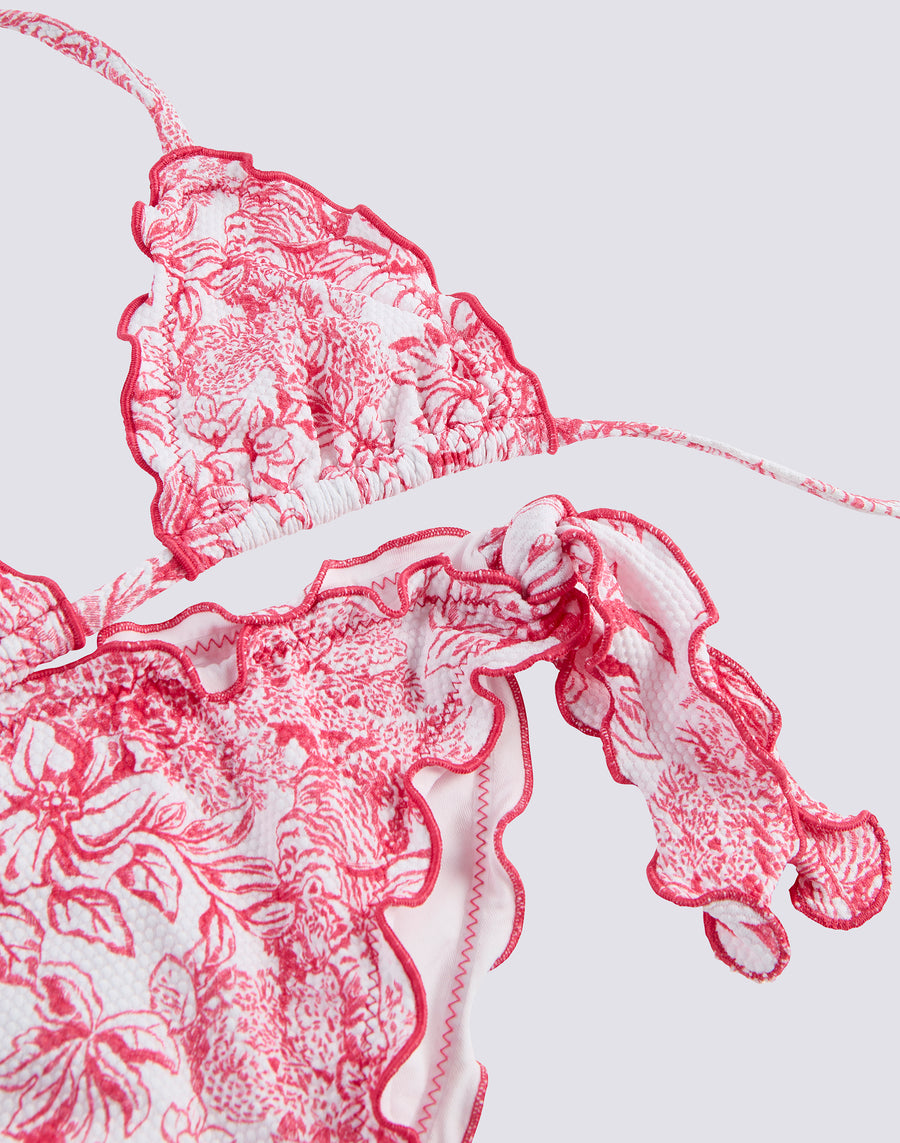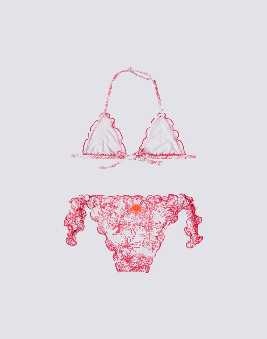 Magnolia mini bikini consisting of a ruffled adjustable triangle top and ruffled brief with bows. Fleur de Joie print and Piquet fabric. Matching model for a mix&match look on the beach.