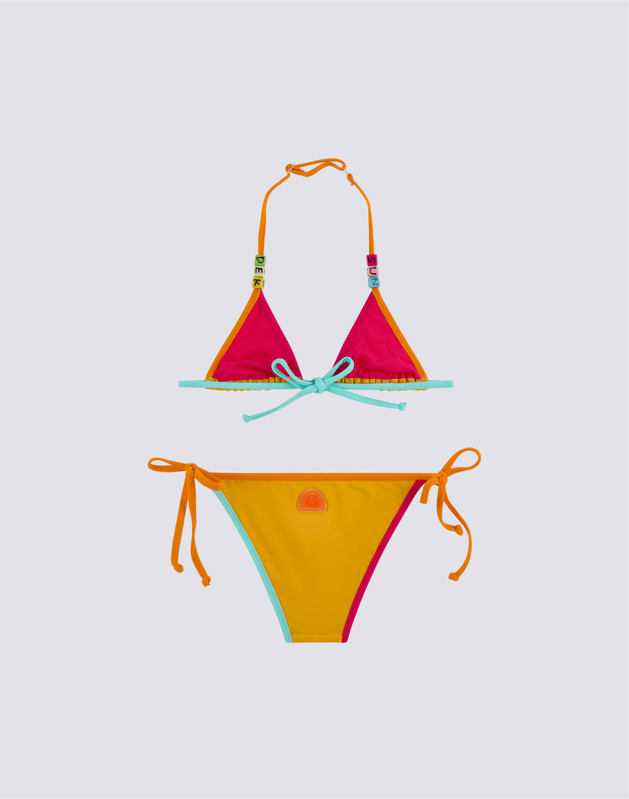 Girl's beach bikini with adjustable triangle top with ties at the back of the neck embellished with multicoloured beads and contrasting piping. The two-piece swimming costume is made of comfortable, durable VITA by Carvico fabric that is resistant to chlorine and sunscreen.