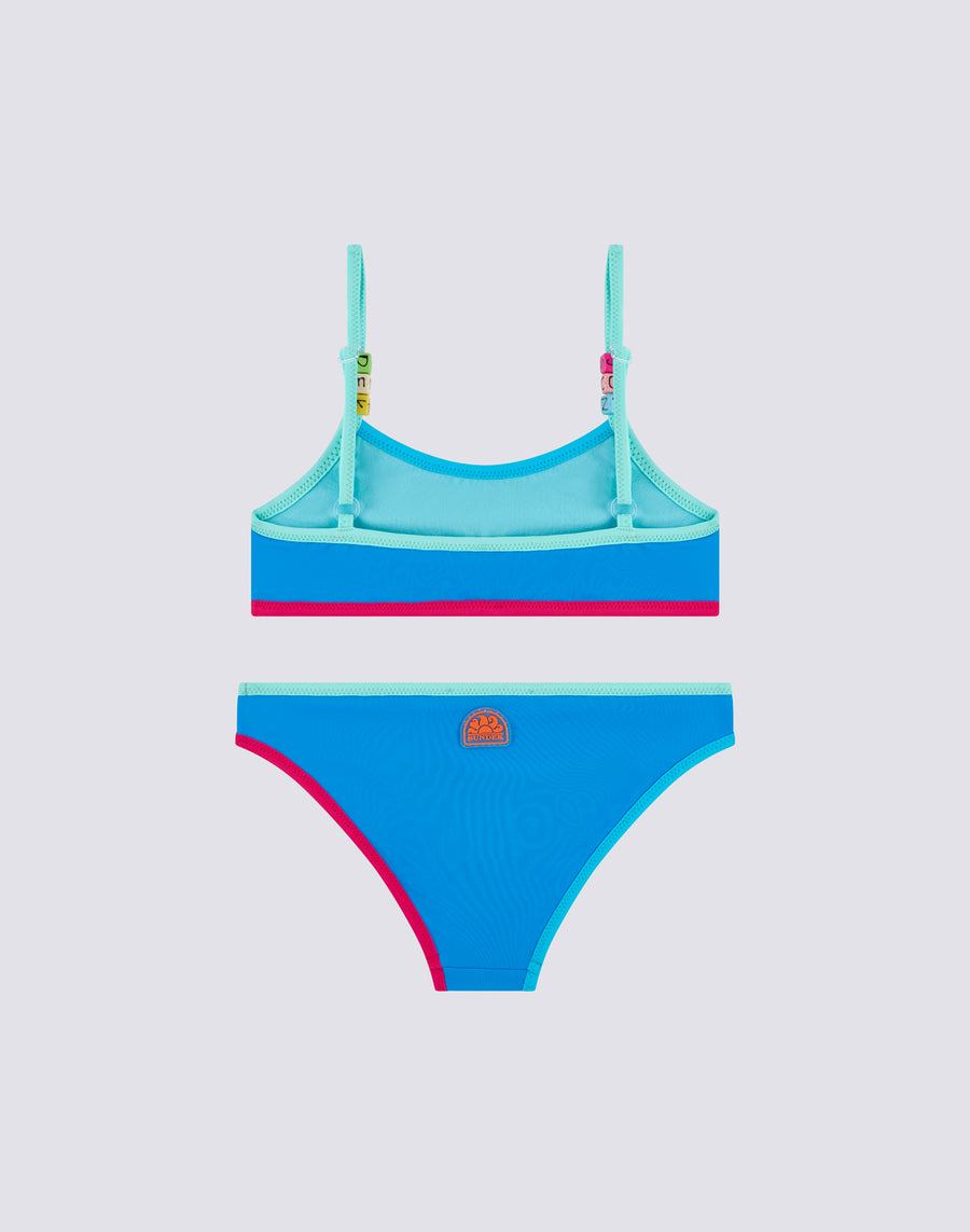 Girl's beach bikini with fixed top and briefs, with ties and contrasting piping. The two-piece swimming costume is made of comfortable, durable VITA by Carvico fabric that is resistant to chlorine and sunscreen.