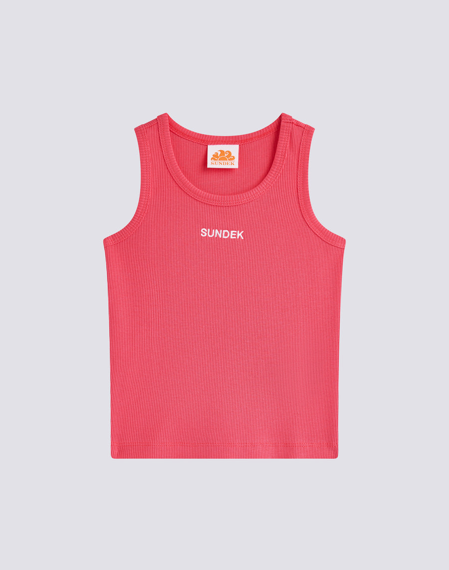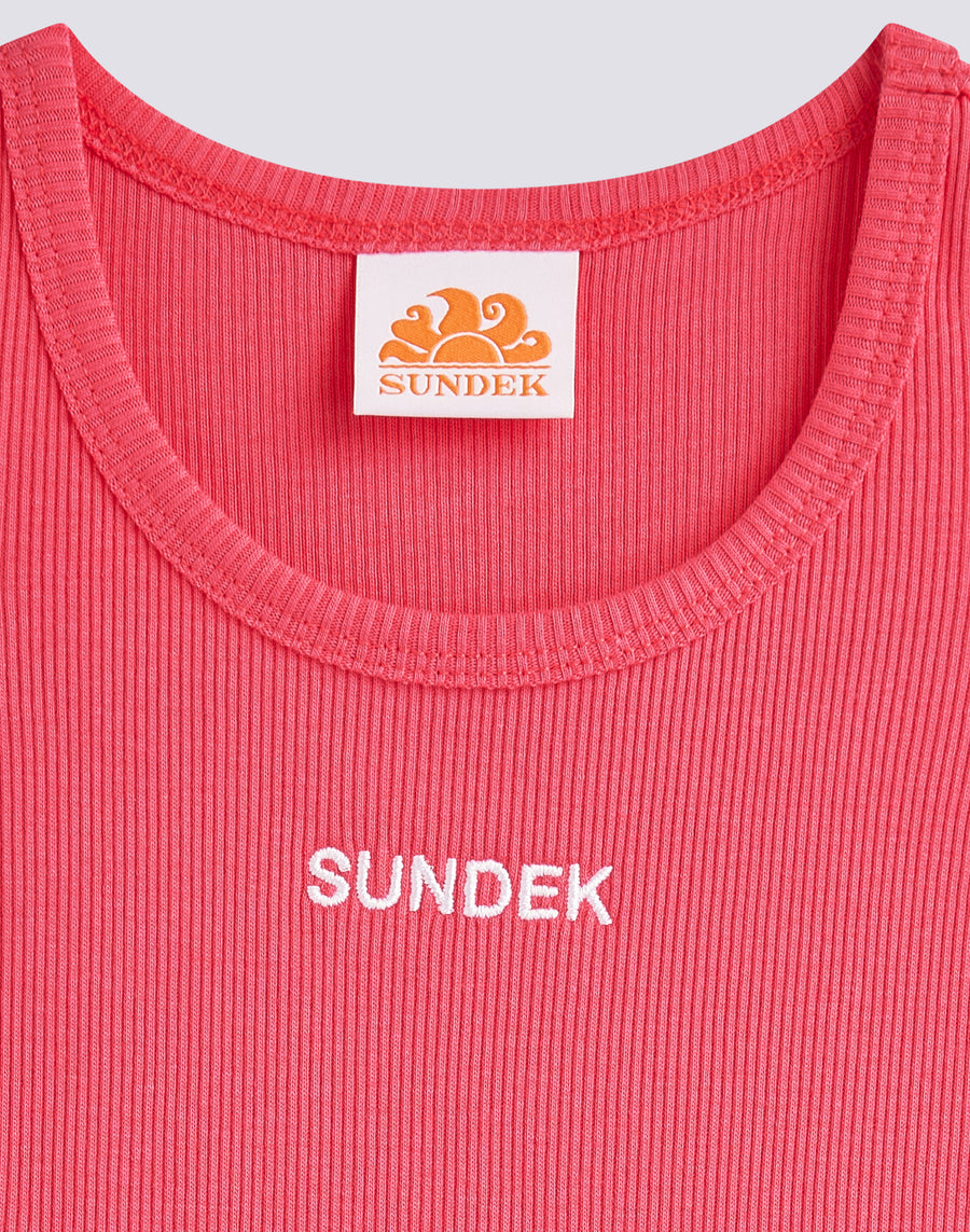Ribbed tank top with Sundek logo embroidered on the front. Girl's model identical to the adult model, to create a matchy matchy look with mum!