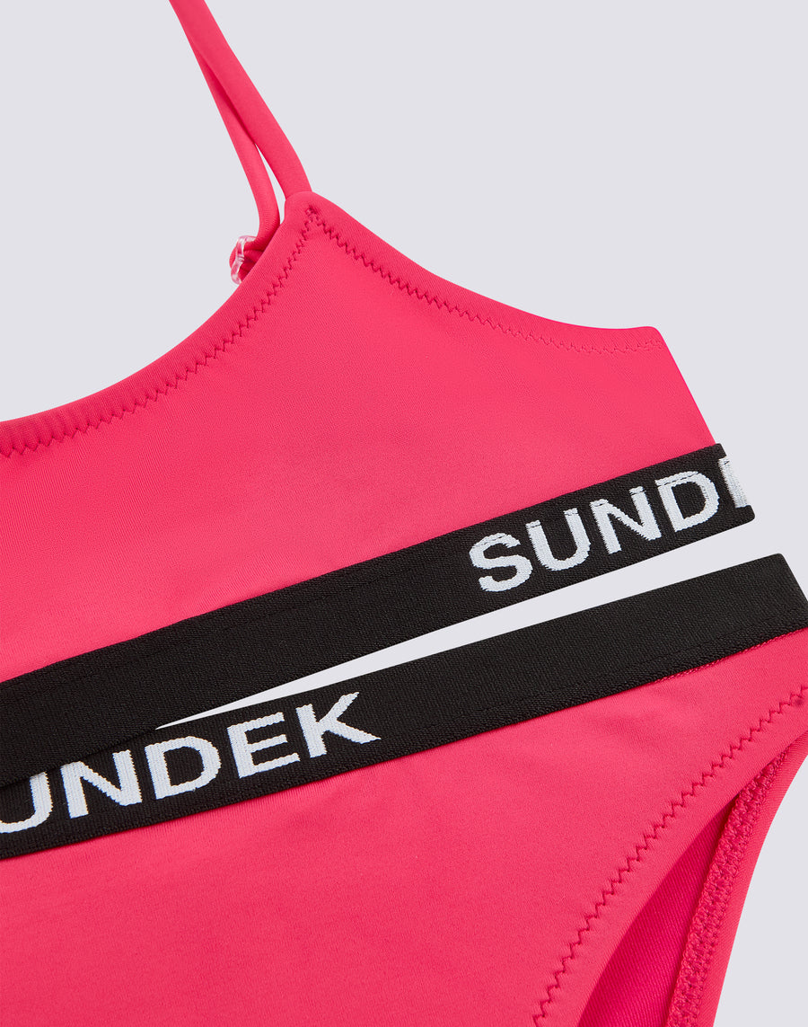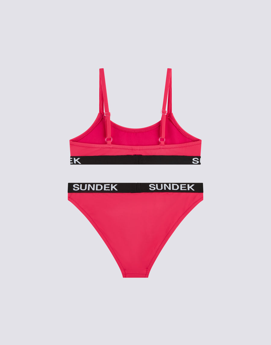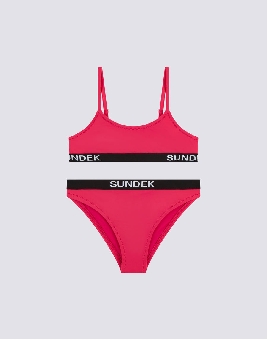 Choose for your little girl this bikini consisting of a bandeau top and elasticated briefs, customised with a contrasting logo. The eco-friendly, soft and durable fabric is suitable for a thousand bathing and playing games on the beach.