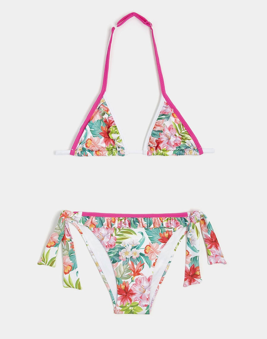 Bright colors and a Hawaiian-inspired floral print for this girl's bikini. Top with adjustable laces and briefs with adjustable bows at the sides.