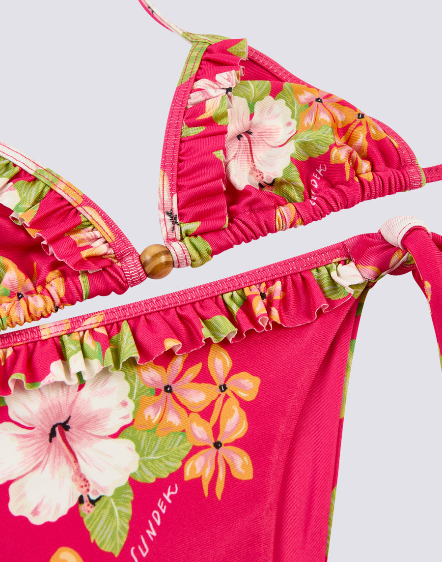 Mini bikini with triangle with ruffles and beads and briefs with ties, in a Dreamy Hawaii pattern. For romantic little girls who want a colourful and lively costume.