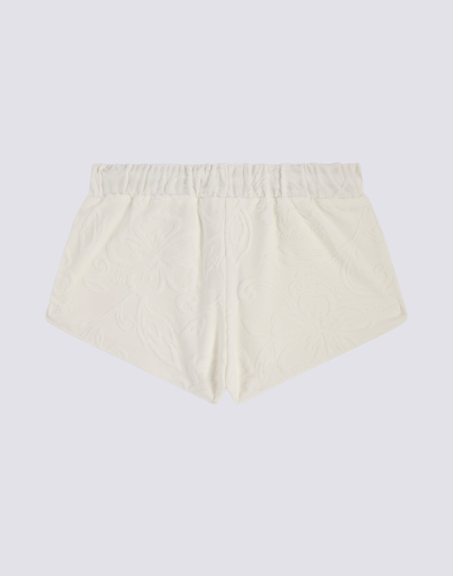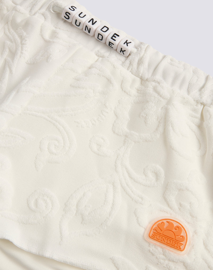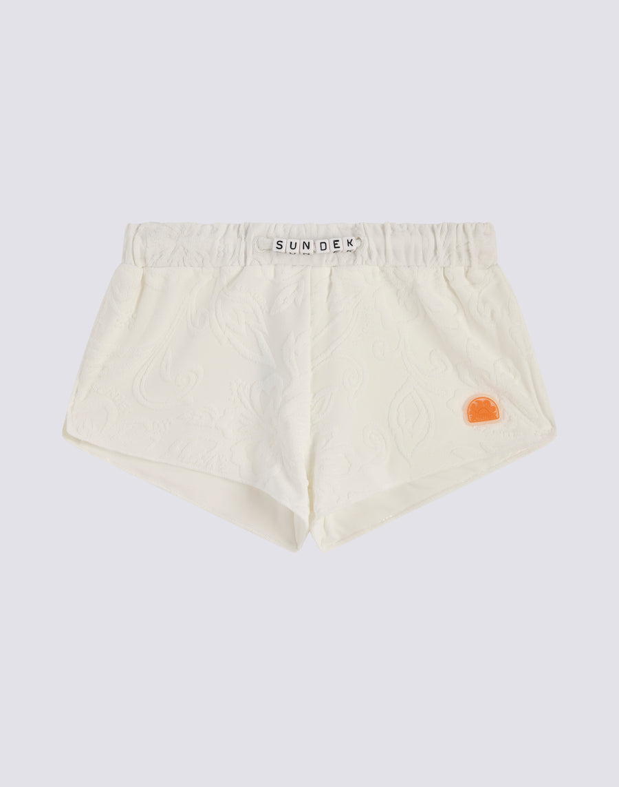 Girl's jacquard terry shorts with SK23 pattern. With an elasticated waist and drawstring, they are perfect to wear over the matching patterned bikini.
