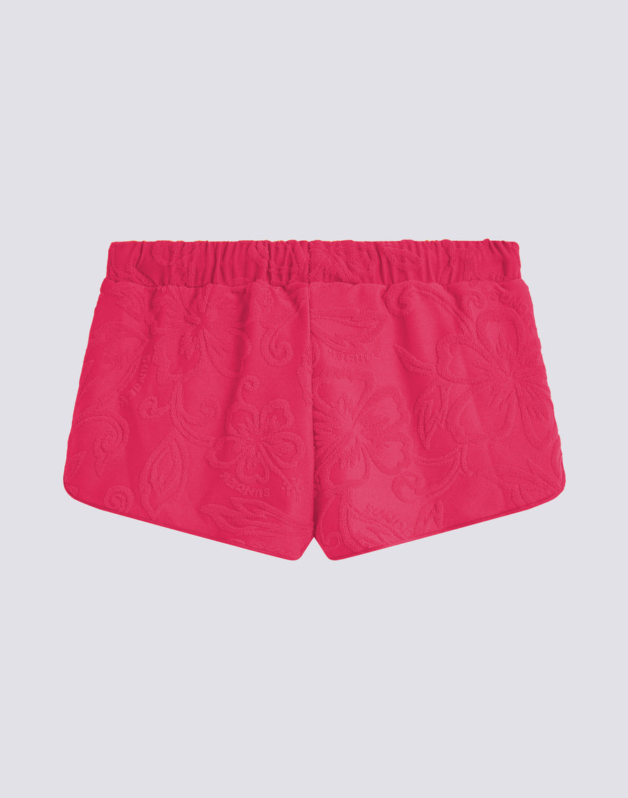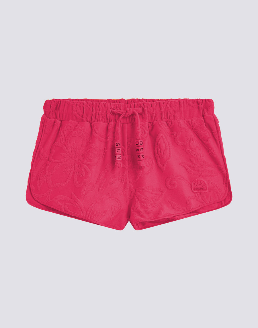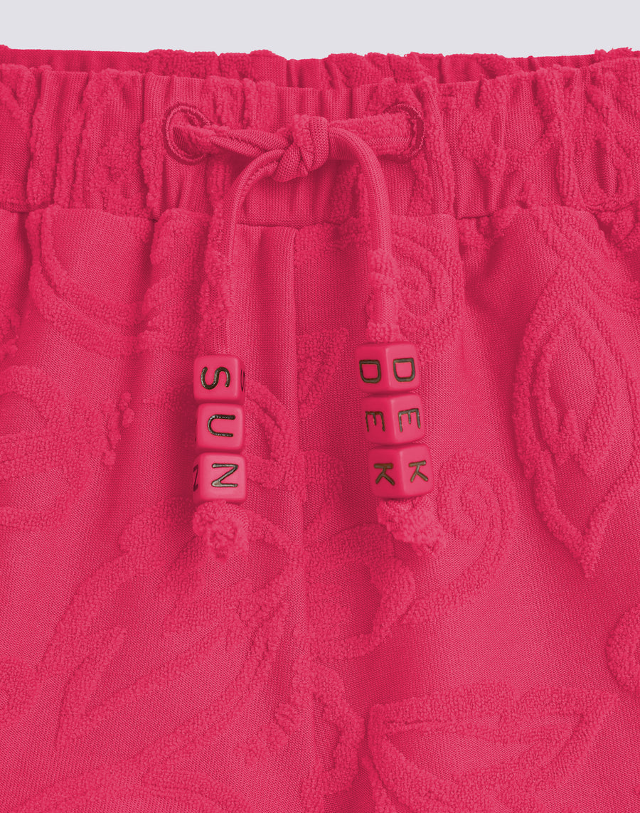 Girl's jacquard terry shorts with SK23 pattern. With an elasticated waist and drawstring, they are perfect to wear over the matching patterned bikini.