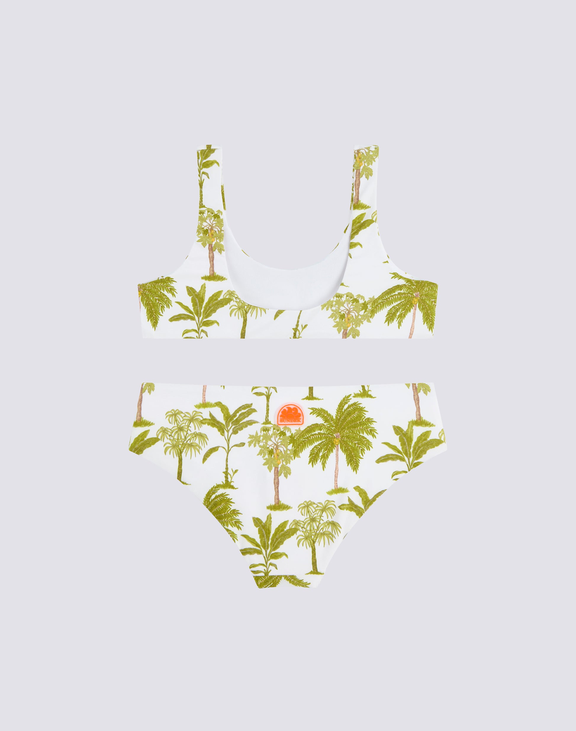 Sporty-style girls' bikini with Botanic print, consisting of fixed briefs and a top with wide straps.
