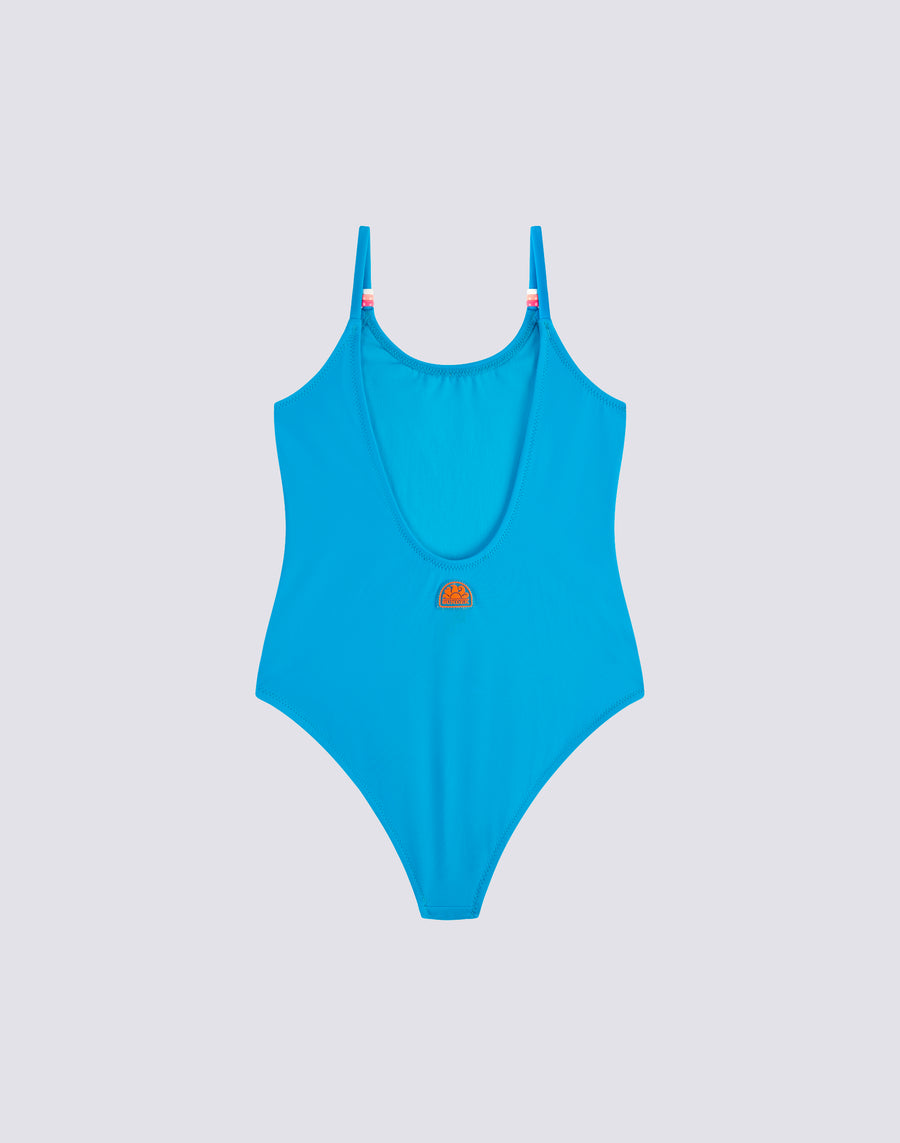 Sundek logo patch in rubber on the back of the swimsuit