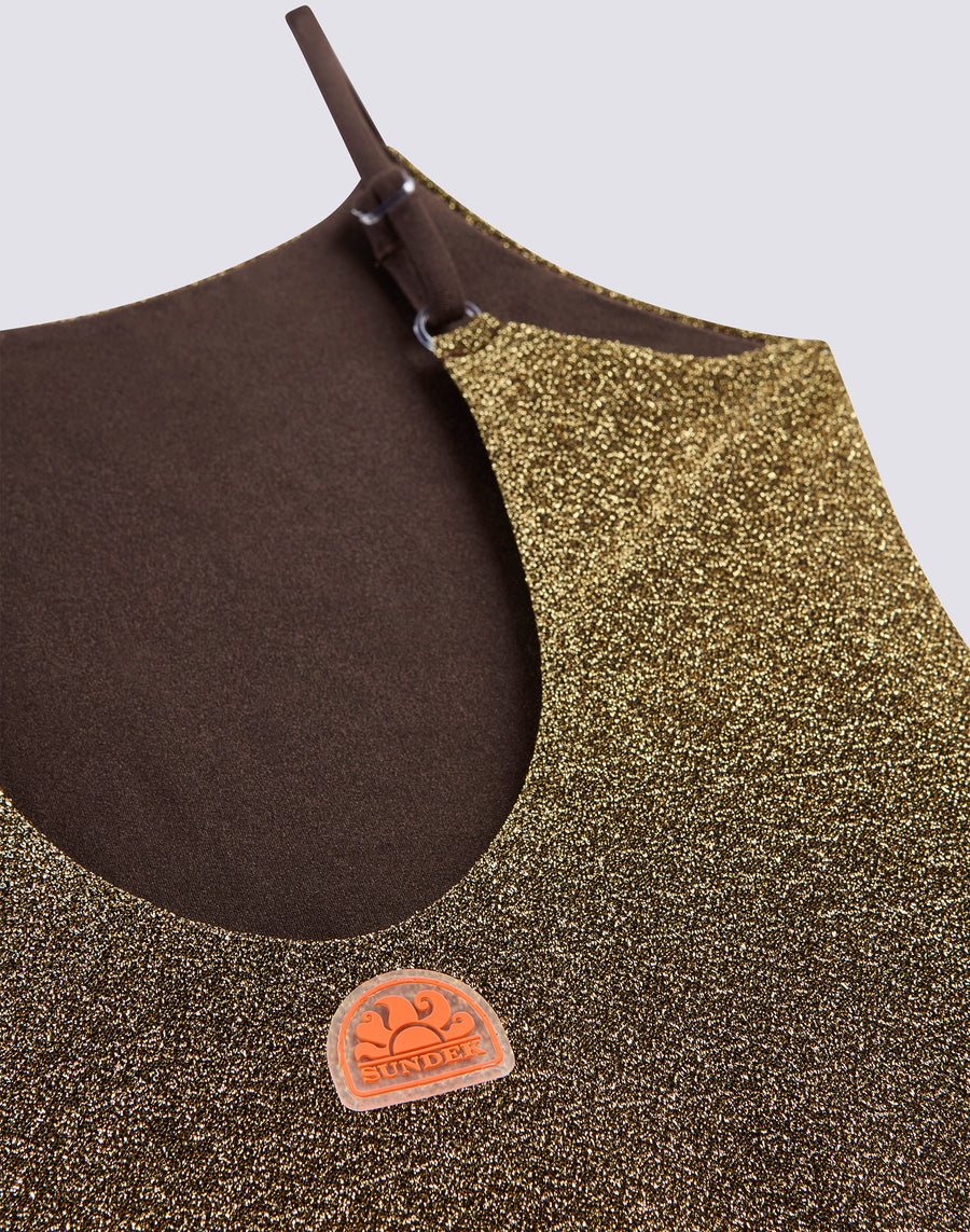 Sparkling thanks to the lurex, to be shown off at the shore or on a day at the pool, matching the adult model for mum.