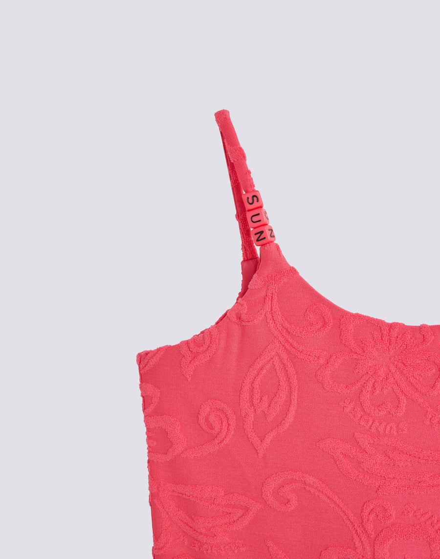 Girl's one-piece terry swimming costume with SK23 pattern and cubic beads as detail. Soft and comfortable for endless bathing and playing on the shore.