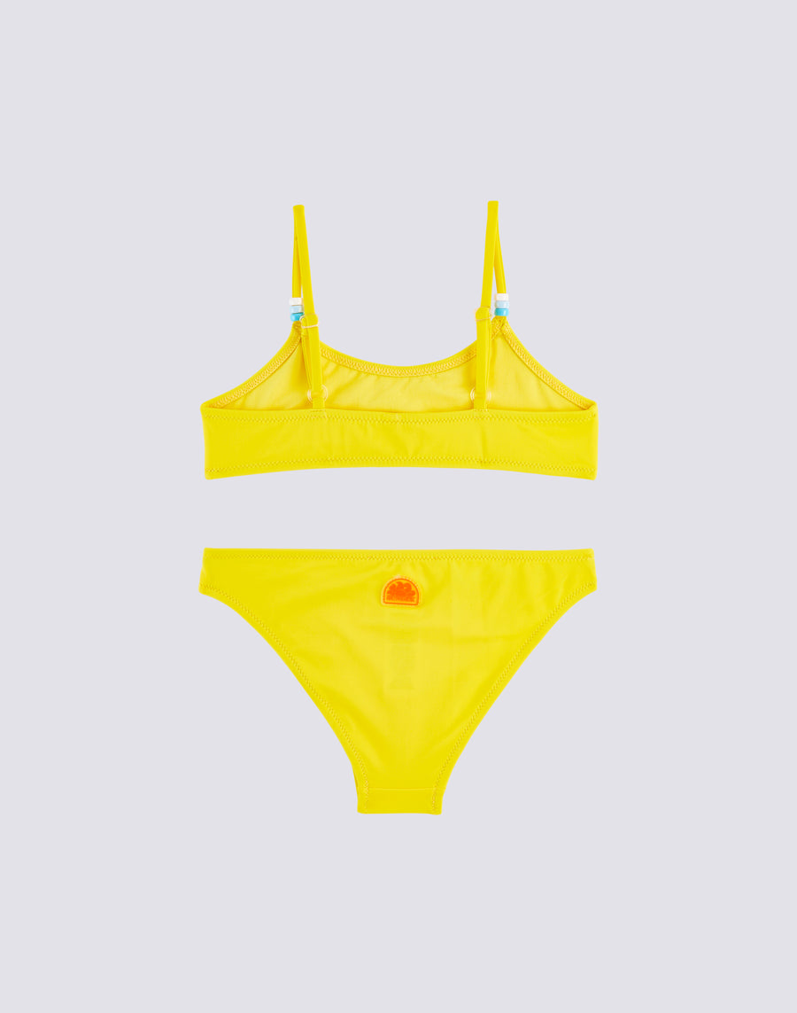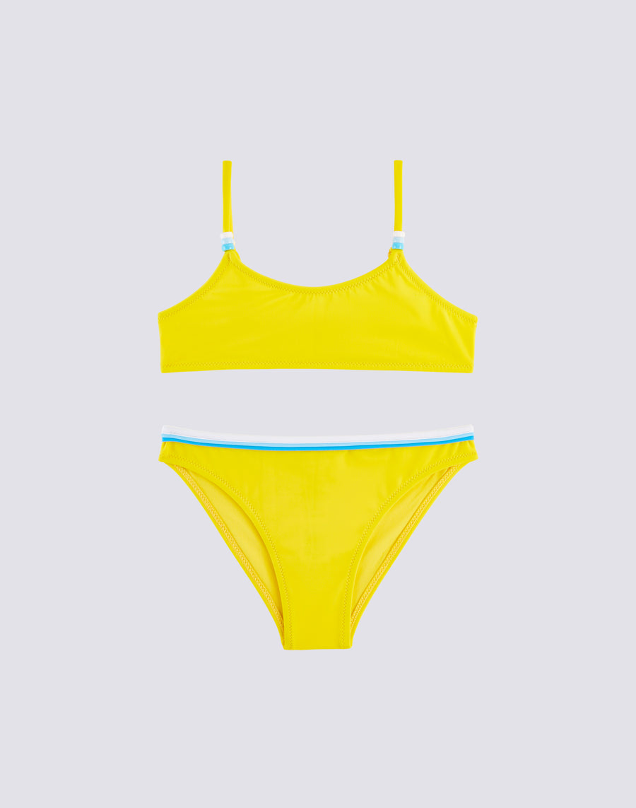 Little girl beach bikini with adjustable top with laces embellished with beads. The color of the beads is reproduced on the tricolor detail of the briefs. The two-piece swimsuit is made of comfortable, resistant VITA by Carvico fabric that is resistant to chlorine and sunscreens.