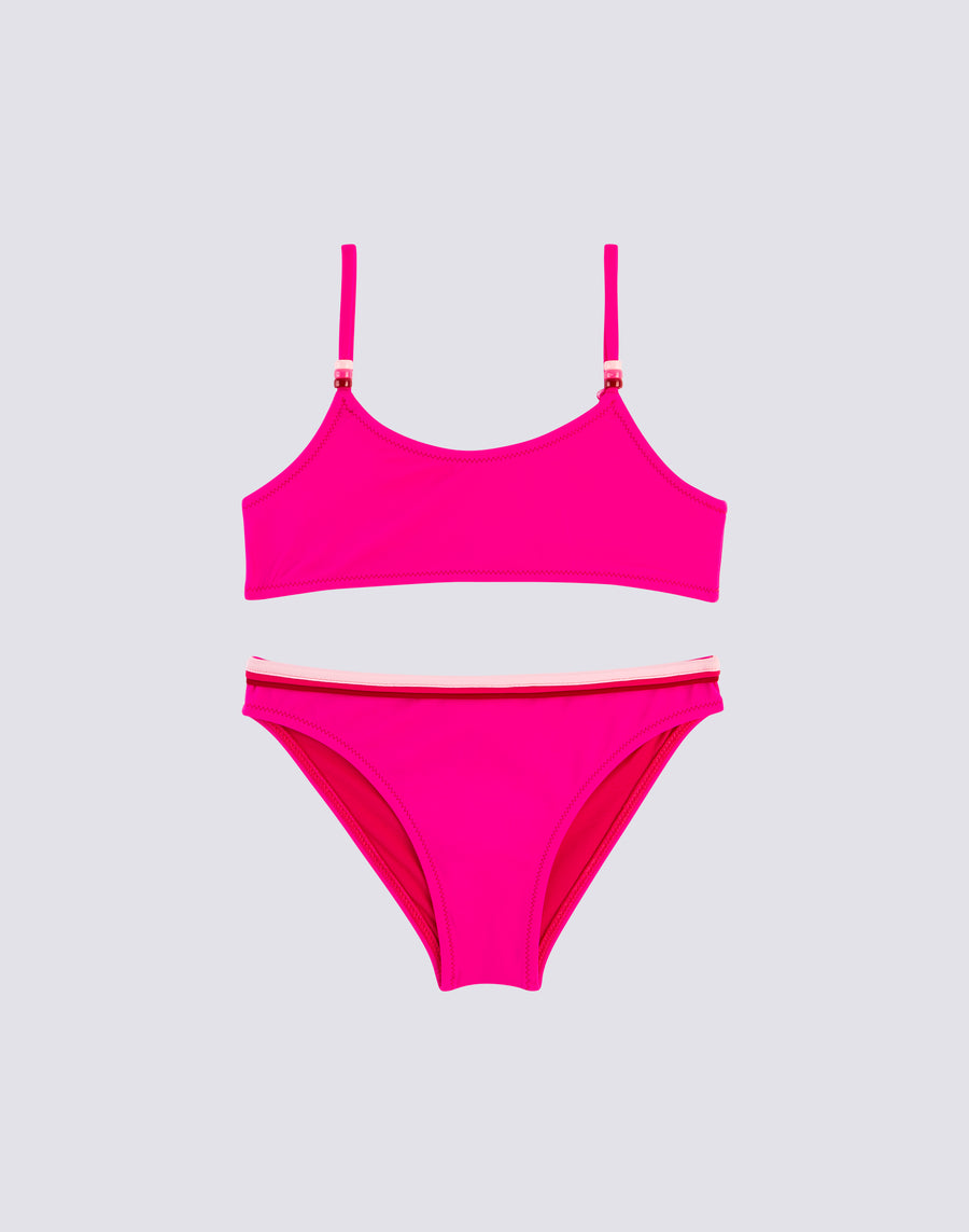 Little girl beach bikini with adjustable top with laces embellished with beads. The color of the beads is reproduced on the tricolor detail of the briefs. The two-piece swimsuit is made of comfortable, resistant VITA by Carvico fabric that is resistant to chlorine and sunscreens.