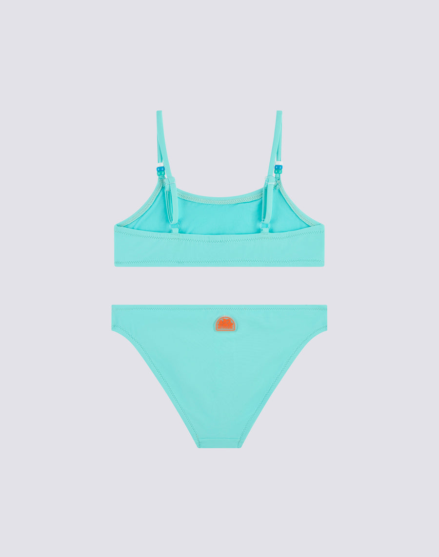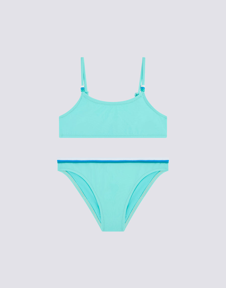 Girl's beach bikini with an adjustable top with bead-embellished ties. The colour of the beads is repeated on the three-coloured detail of the bikini bottom. The two-piece swimming costume is made of VITA by Carvico fabric that is comfortable, durable and resistant to chlorine and sunscreen.