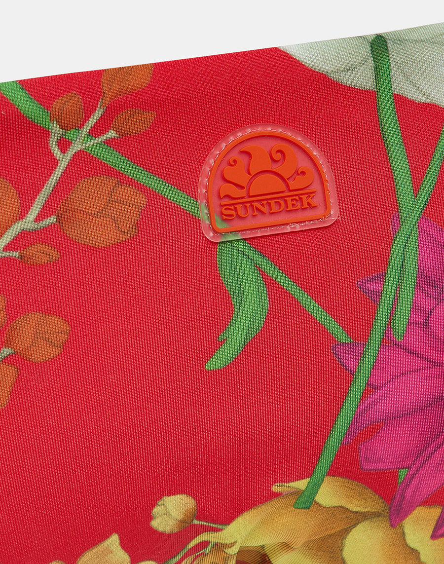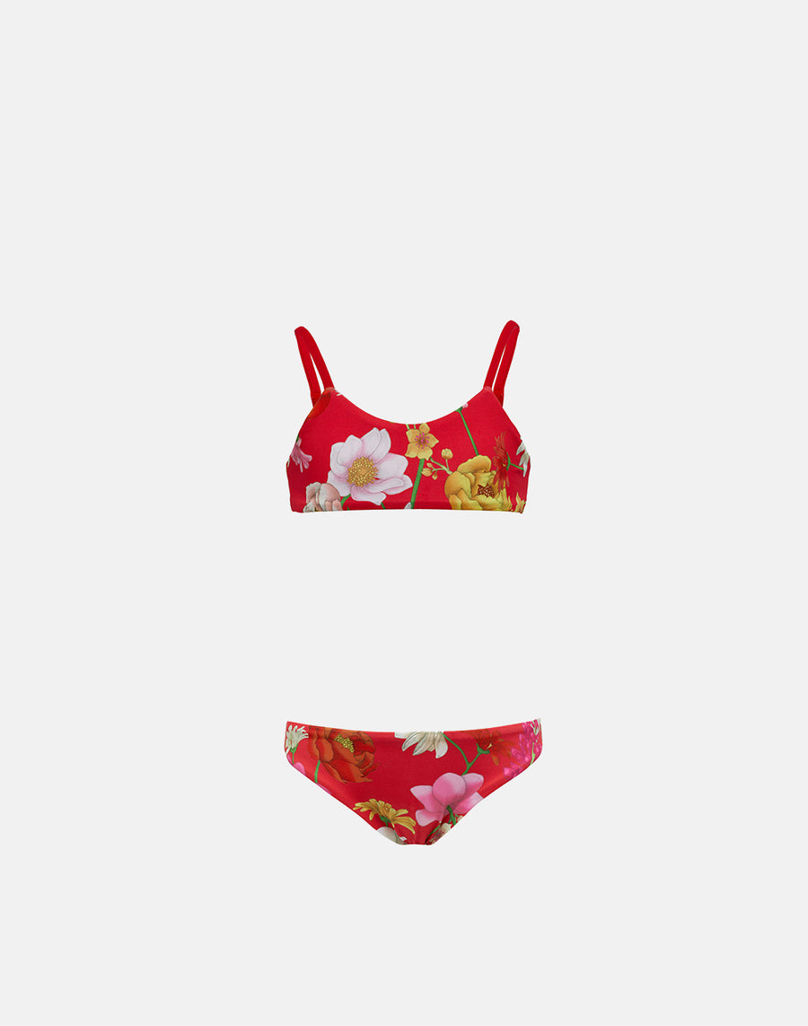 Made up of a bandeau top and standard briefs, this simple and understated bikini is embellished with the refined Royal Flower print: perfect for little girls who want to wear their swimsuit every day.