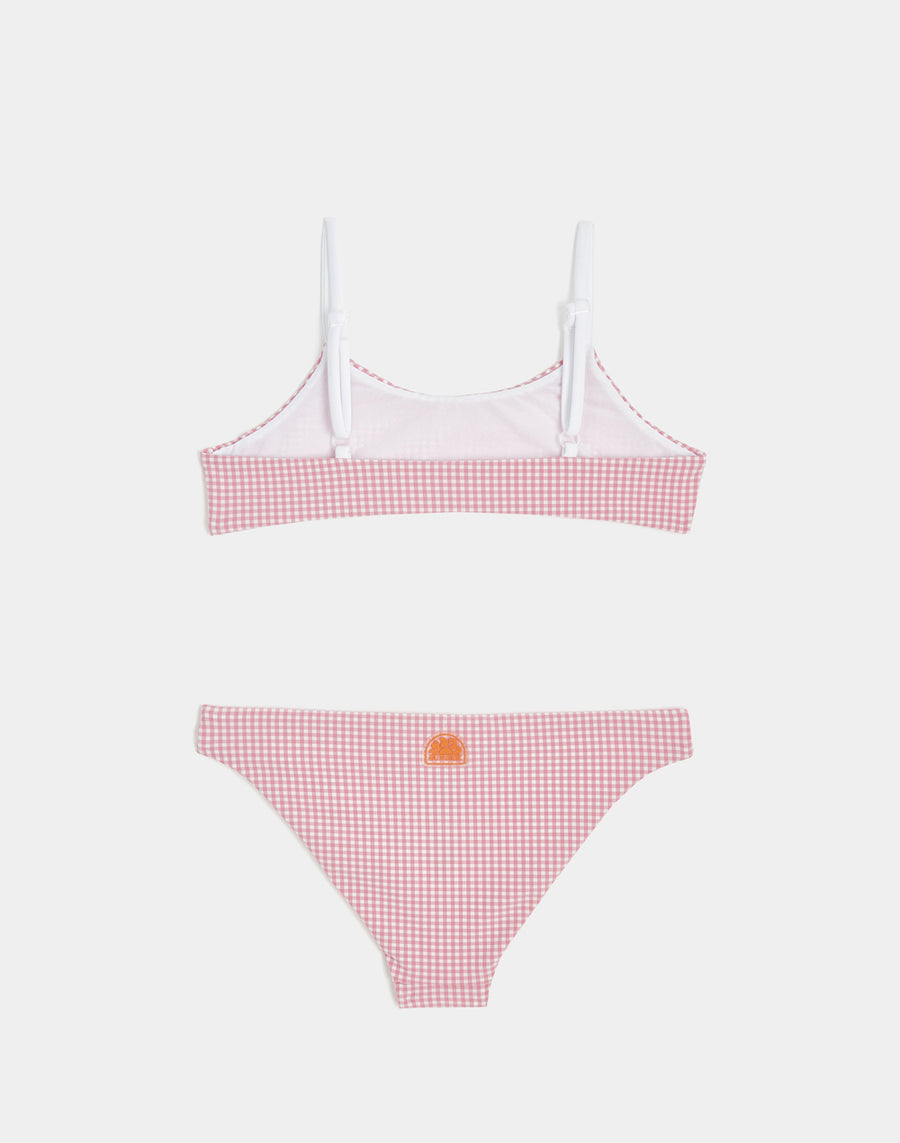 Girl's 2-piece costume consisting of bralette top and fixed bottom in a Vichy pattern.