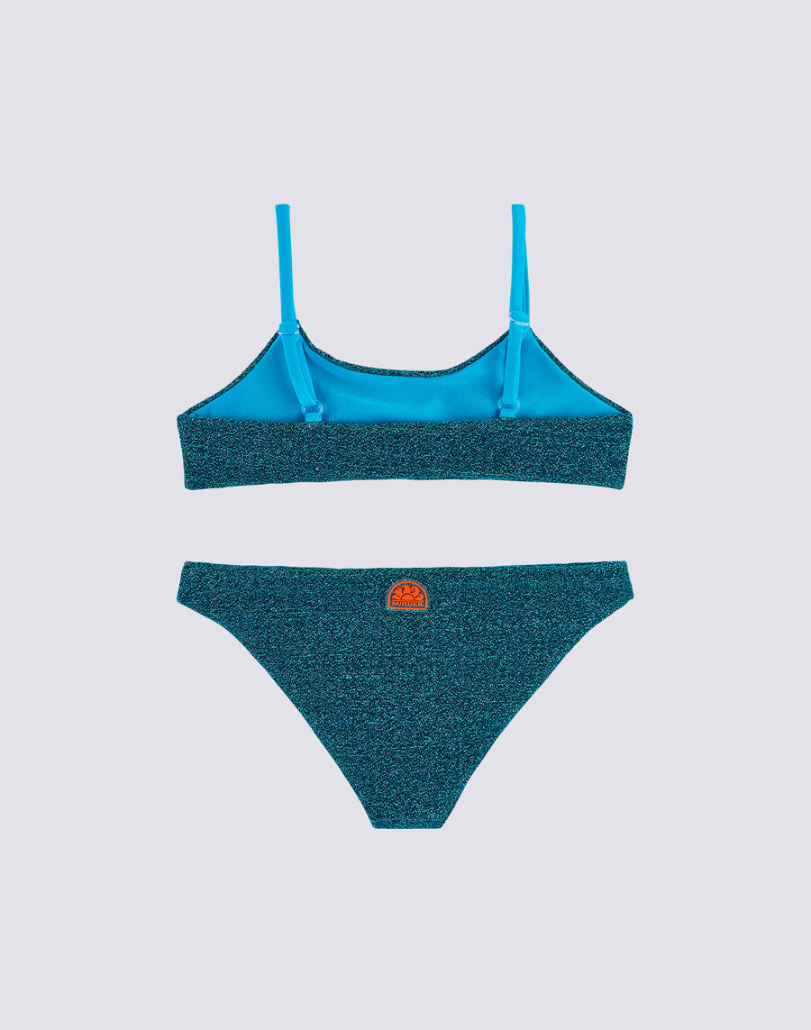 To shine together in the sun, choose this girls' lurex bikini, designed to match mum's swimsuit. Little ones will love this set, made up of a bandeau top and briefs in bright and comfortable lurex. Combine it with the matching beach dress.