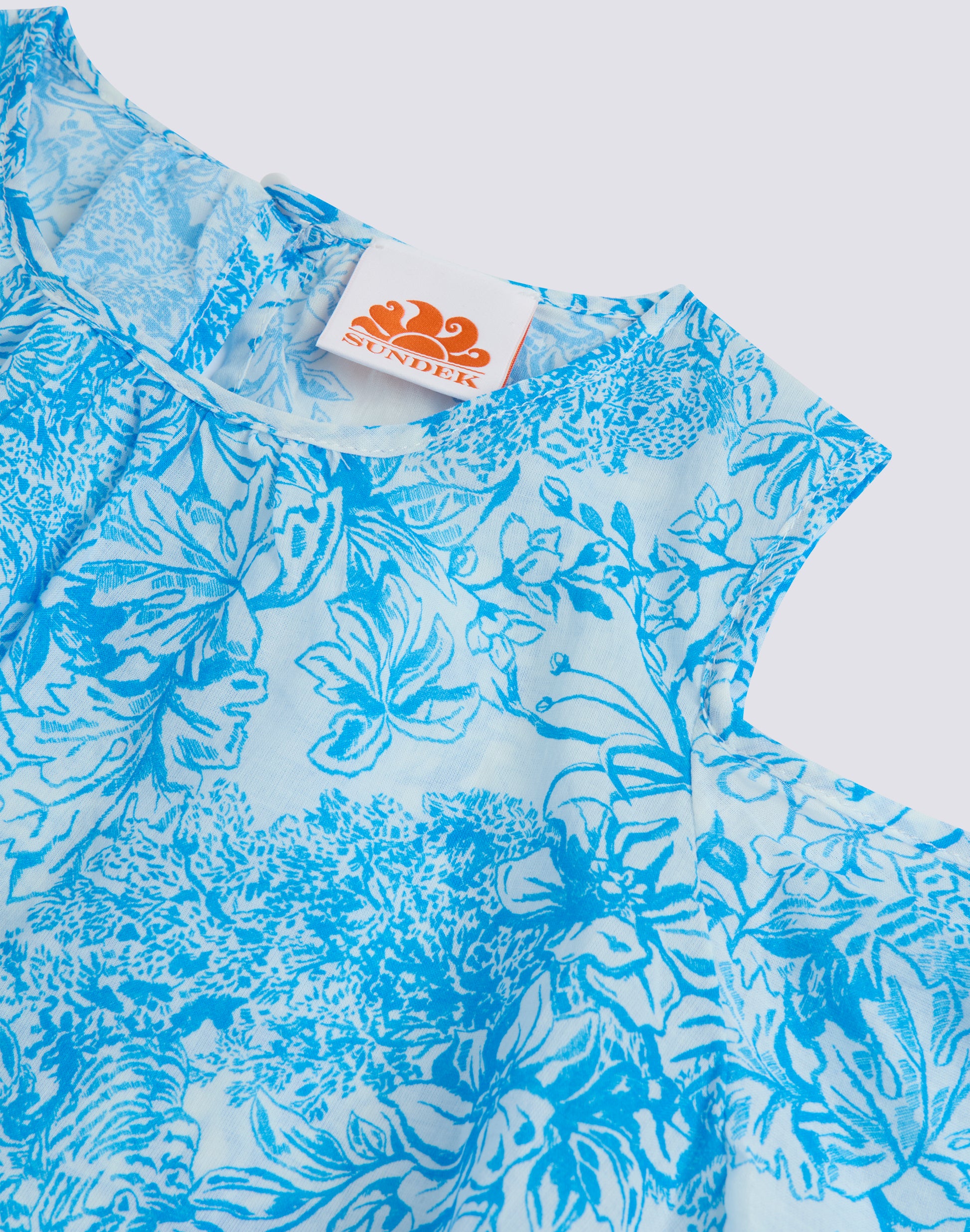 Girl's short dress with elegant Fleur de Joie print. With long sleeves and an opening at the shoulders, it is the ideal garment to wear for special occasions, perhaps coordinated with the same model in the adult version.