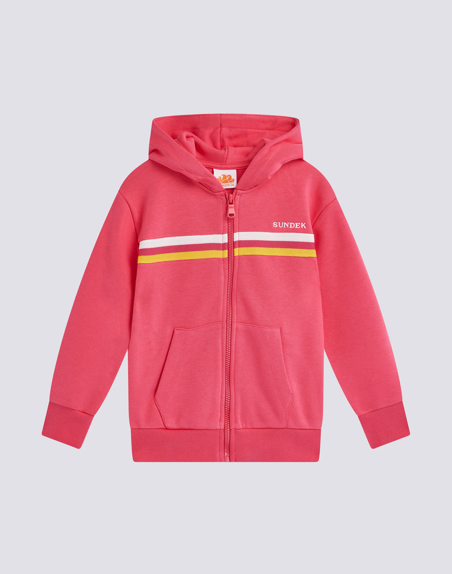 Girl's hooded sweatshirt with full central zip, pockets and rainbow tricolour detail. Combine with long trousers or fleece Bermuda shorts for a colourful and lively outfit.
