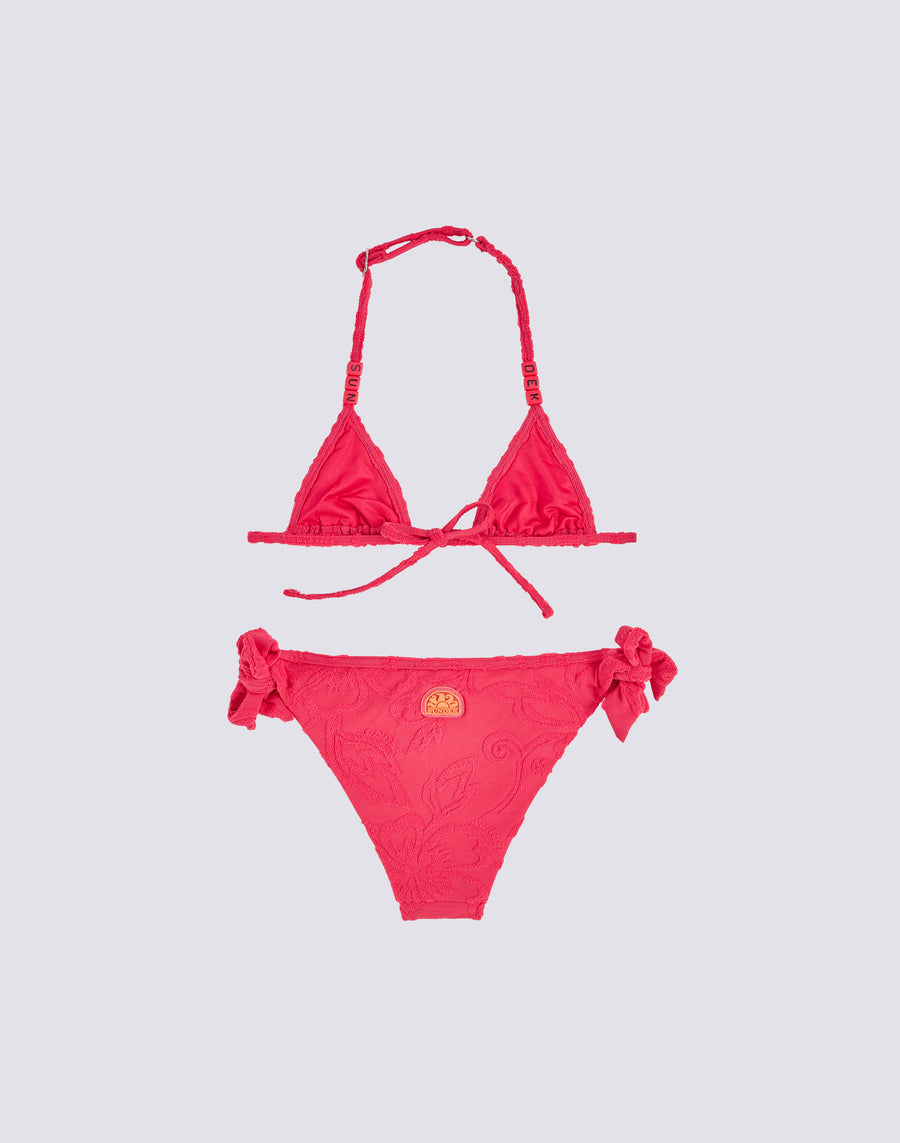 Jacquard terry mini bikini with SK23 pattern consisting of triangle with adjustable ties and briefs with bows, also adjustable.