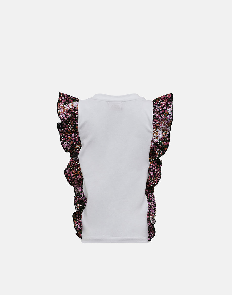 Crew-neck cropped T-shirt with ruffles. Provençal print