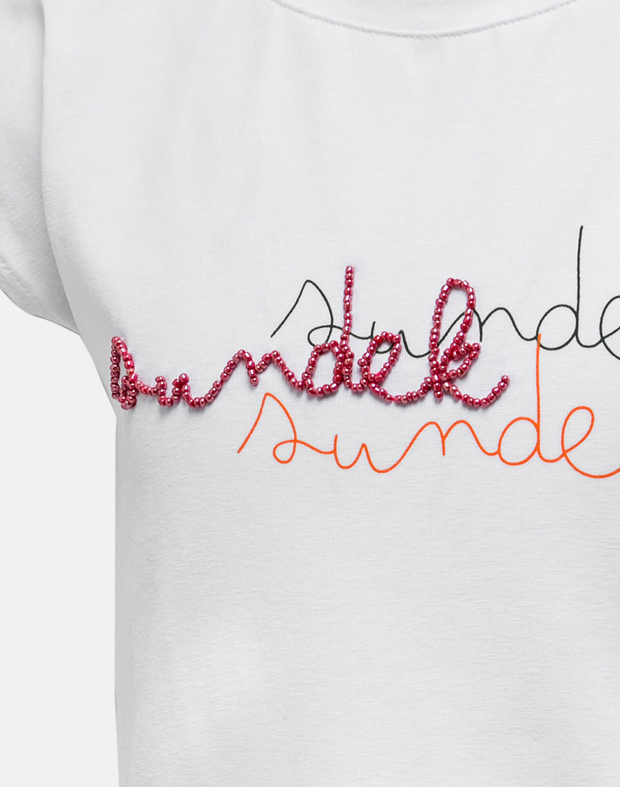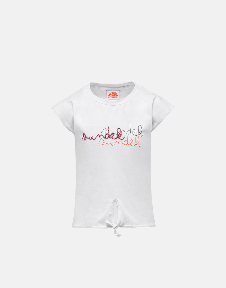 A fun and versatile T-shirt to wear all summer long with a whole range of outfits: the sleeveless cropped design features central ties and Sundek lettering with bead embroidery.