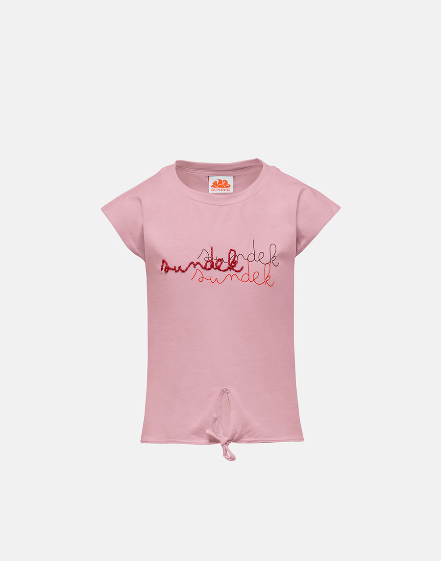 A fun and versatile T-shirt to wear all summer long with a whole range of outfits: the sleeveless cropped design features central ties and Sundek lettering with bead embroidery.