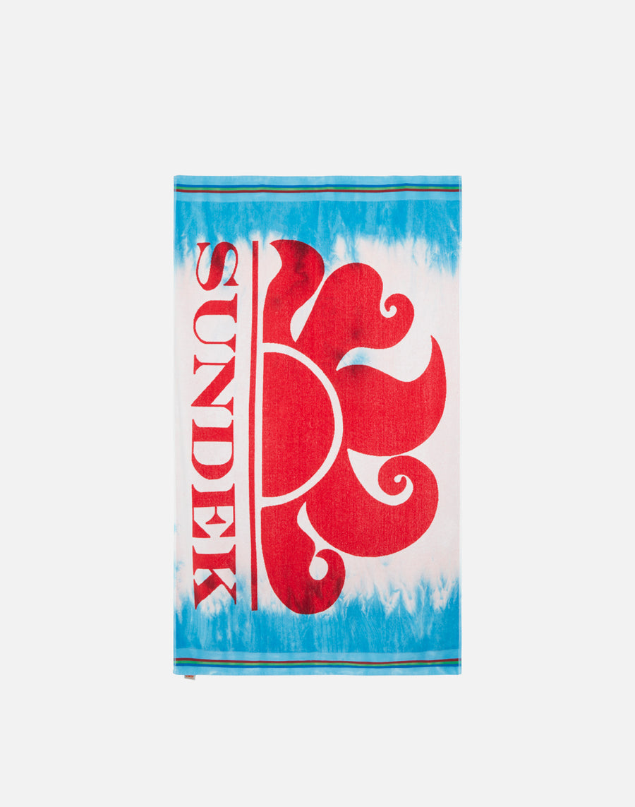 Original beach towel in tie-dye craftsmanship, characterized by the iconic Sundek rainbow in jacquard at the 2 ends.