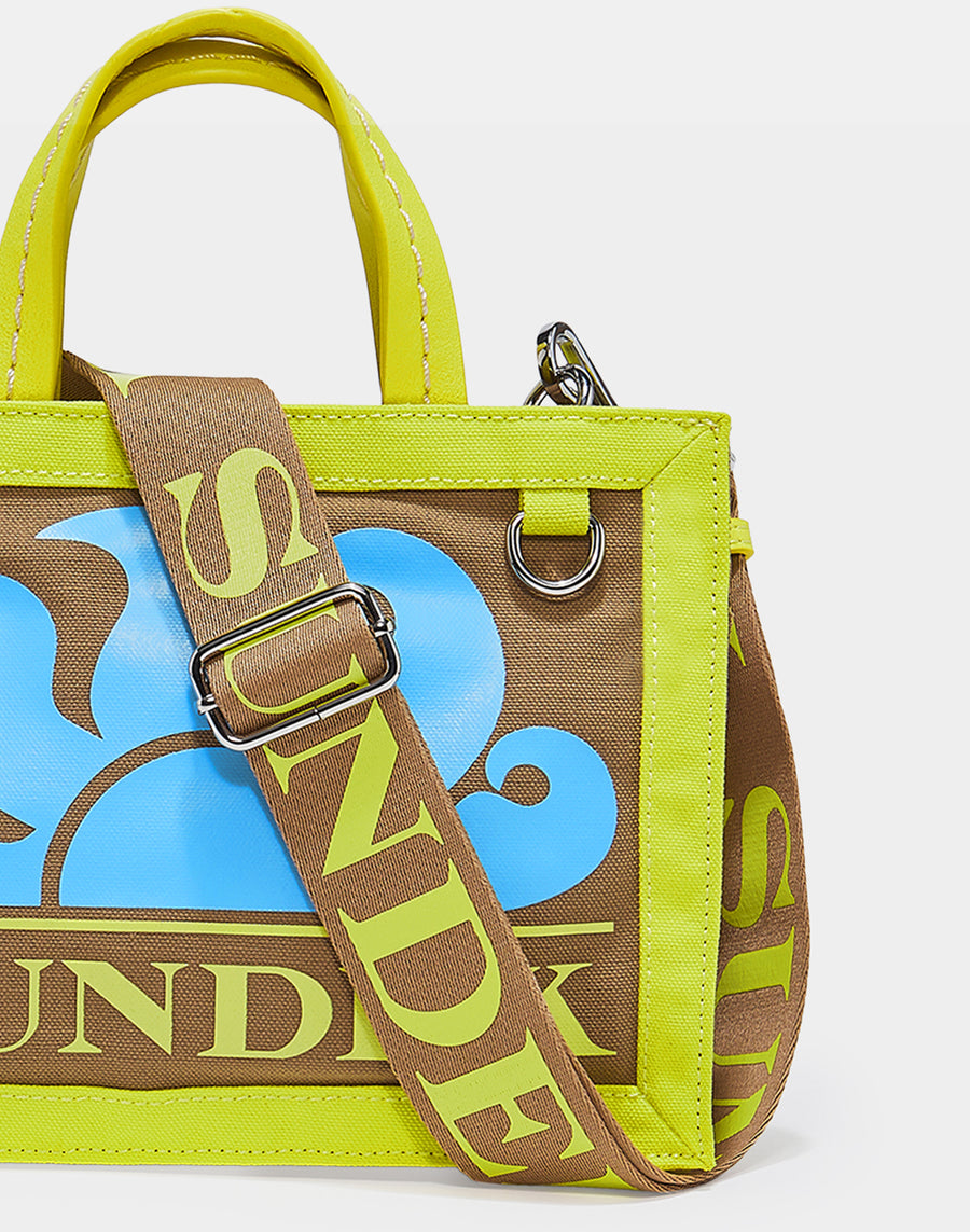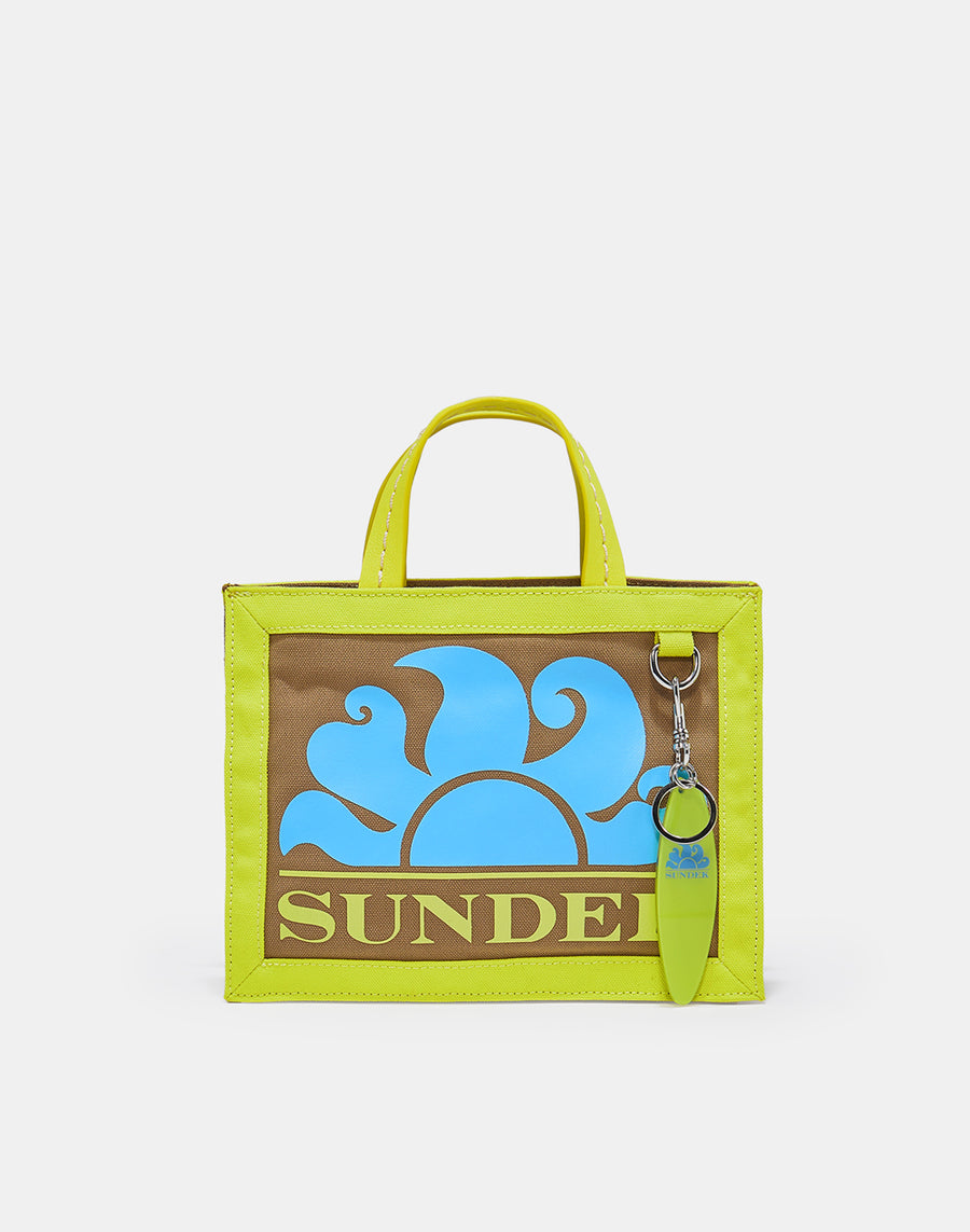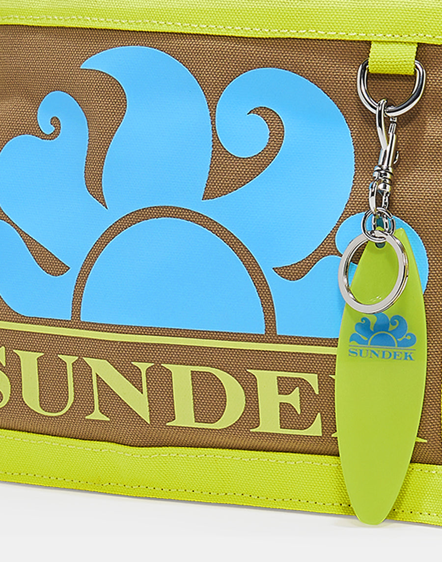 Small bag designed to carry by hand or across the body. Made from canvas with a printed logo and detachable crossbody strap. Iconic surfboard charm inspired by the history of Sundek