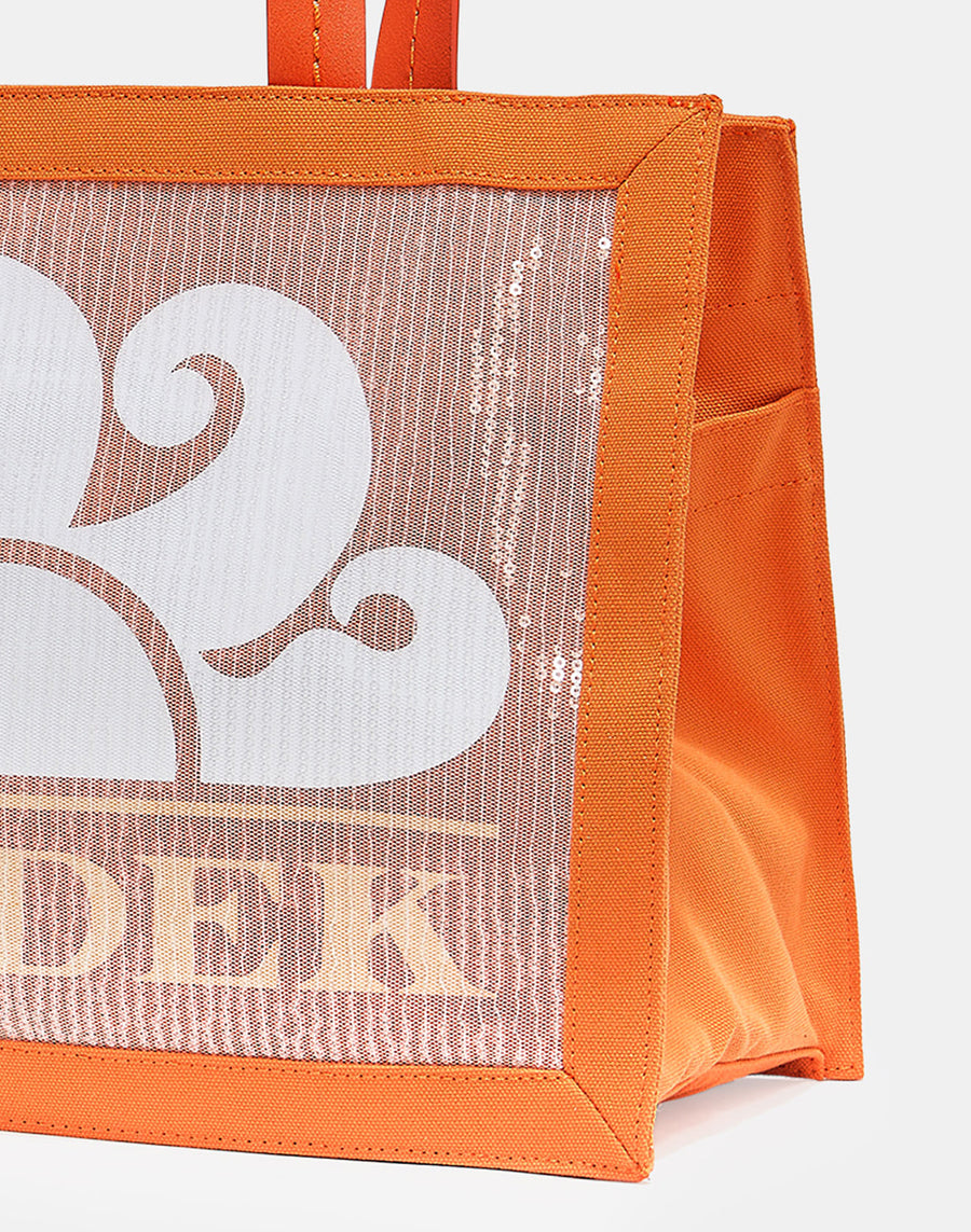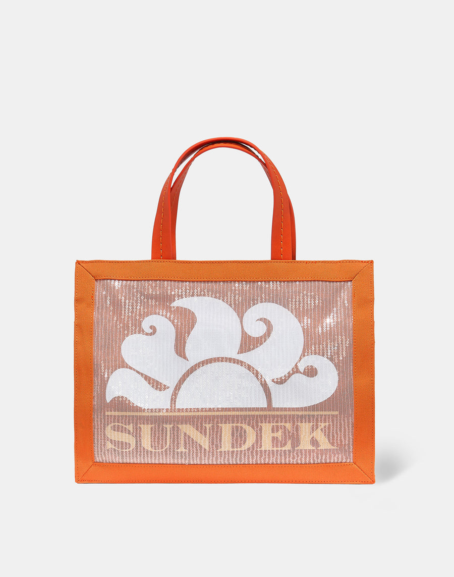 Medium mesh bag with sequinned details and a printed Sundek logo. This bag is perfect for the beach thanks to its fine mesh, designed to prevent sand from getting in. Appliquéd surfboard charm.