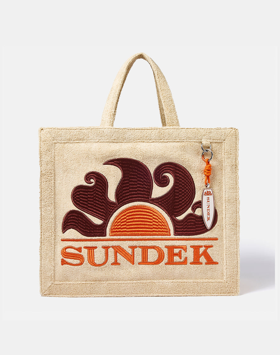 Towelling beach bag with an embroidered logo. Iconic surfboard charm